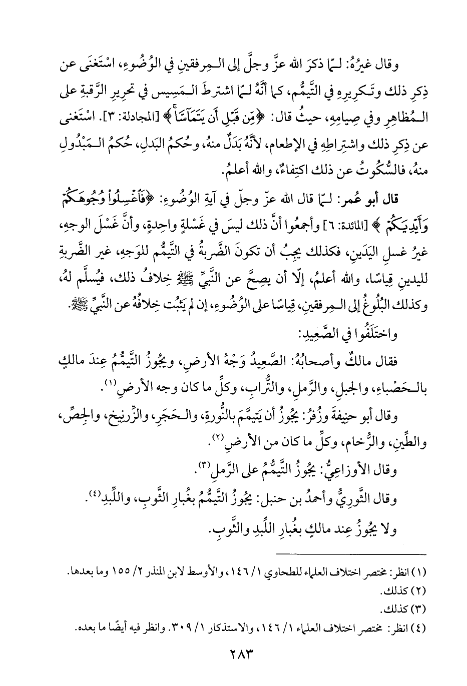 قال أبو عُمر: لمّا قال الله عزّ وجلّ في آيةِ الوُضُوءِ: {فَاغْسِلُوا وُجُوهَكُمْ وَأَيْدِيَكُمْ} [المائدة: ٦] وأجمعُوا أنَّ ذلك ليسَ في غَسْلةٍ واحِدةٍ، وأنَّ غَسْلَ الوجهِ، غيرُ غسلِ اليَدَينِ، فكذلك يجِبُ أن تكونَ الضَّربةُ في التَّيمُّم للوَجهِ، غير الضَّربةِ لليدينِ قِياسًا، والله أعلمُ، إلّا أن يصِحَّ عن النَّبيِّ - صلى الله عليه وسلم - خِلافُ ذلك، فيُسلَّم لهُ، وكذلك البُلُوغُ إلى المِرفقينِ، قِياسًا على الوُضُوءِ، إن لم يَثبُت خِلافُهُ عن النَّبيِّ - صلى الله عليه وسلم -.