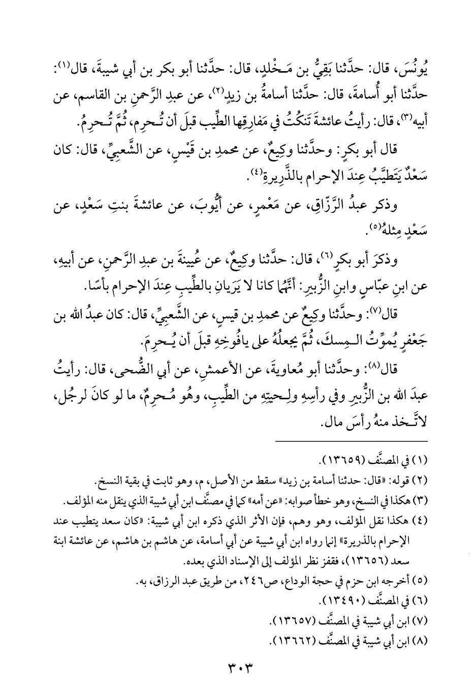 (¬٤) هكذا نقل المؤلف، وهو وهم، فإن الأثر الذي ذكره ابن أبي شيبة: "كان سعد يتطيب عند الإحرام بالذريرة" إنما رواه ابن أبي شيبة عن أبي أسامة، عن هاشم بن هاشم، عن عائشة ابنة سعد (١٣٦٥٦)، فقفز نظر المؤلف إلى الإسناد الذي بعده.