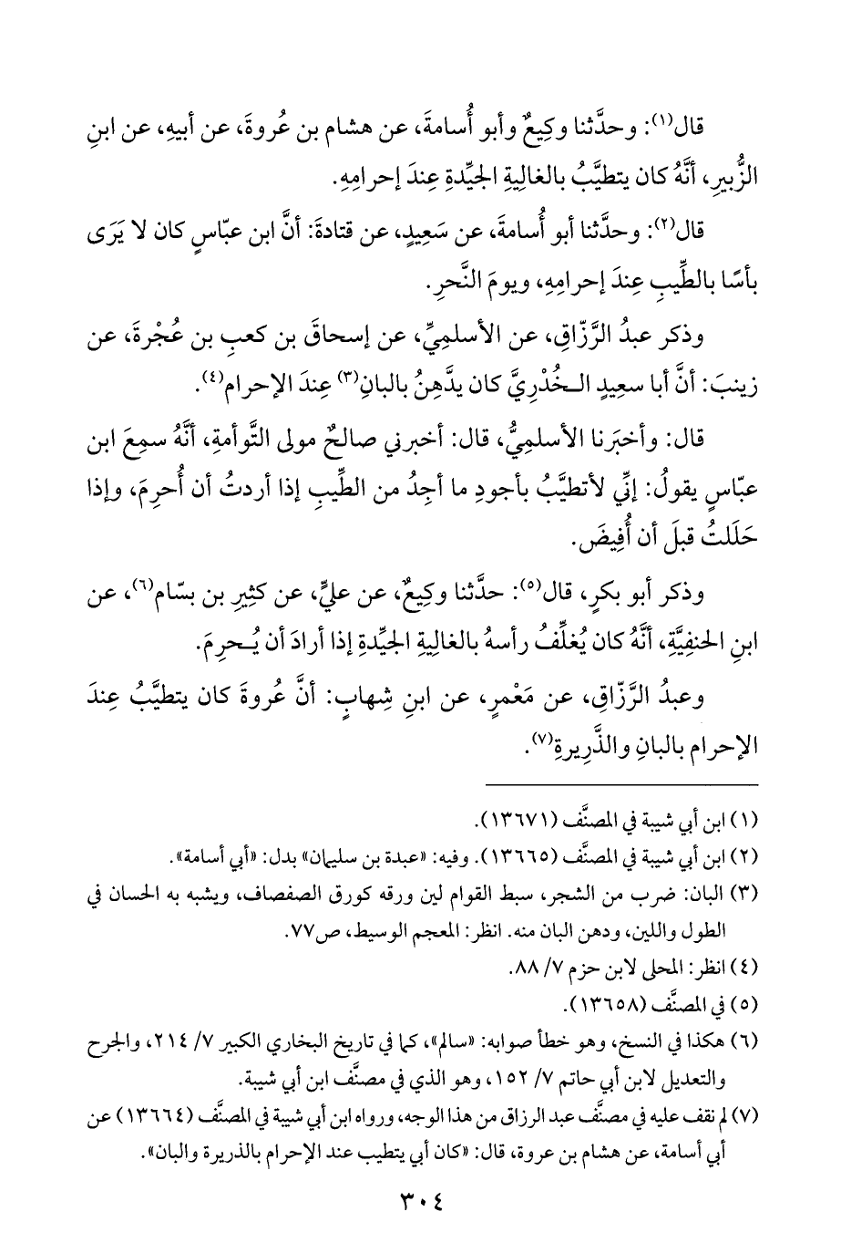 (¬٧) لم نقف عليه في مصنَّف عبد الرزاق من هذا الوجه، ورواه ابن أبي شيبة في المصنَّف (١٣٦٦٤) عن أبي أسامة، عن هشام بن عروة، قال: "كان أبي يتطيب عند الإحرام بالذريرة والبان".