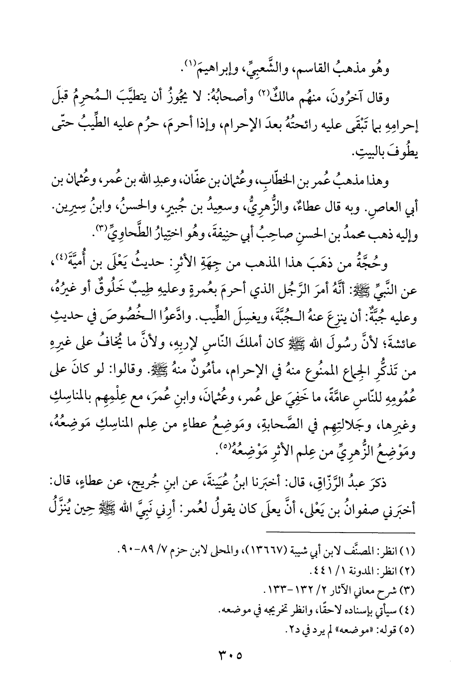 وحُجَّةُ من ذهَبَ هذا المذهب من جِهَةِ الأثرِ: حديثُ يَعْلَى بن أُميَّةَ (¬٤)، عن النَّبيِّ - صلى الله عليه وسلم -: أنَّهُ أمرَ الرَّجُل الذي أحرمَ بعُمرةٍ وعليهِ طِيبٌ خَلُوقٌ أو غيرُهُ، وعليه جُبَّةٌ: أن ينزعَ عنهُ الجُبَّةَ، ويغسِلَ الطِّيب. وادَّعوُا الخُصُوصَ في حديثِ عائشةَ؛ لأنَّ رسُولَ الله - صلى الله عليه وسلم - كان أملكَ النّاسِ لإربِهِ، ولأنَّ ما يُخافُ على غيرِهِ من تَذكُّرِ الجِماع الممنُوع منهُ في الإحرام، مأمُونٌ منهُ - صلى الله عليه وسلم -. وقالوا: لو كانَ على عُمُومِهِ للنّاسِ عامَّةً، ما خَفِيَ على عُمر، وعُثمانَ، وابنِ عُمرَ، مع عِلْمِهِم بالمناسِكِ وغيرِها، وجَلالتِهِم في الصَّحابةِ، ومَوضِعُ عطاءٍ من عِلم المناسِكِ مَوضِعُهُ، ومَوْضِعُ الزُّهرِيِّ من عِلم الأثرِ مَوْضِعُهُ (¬٥).