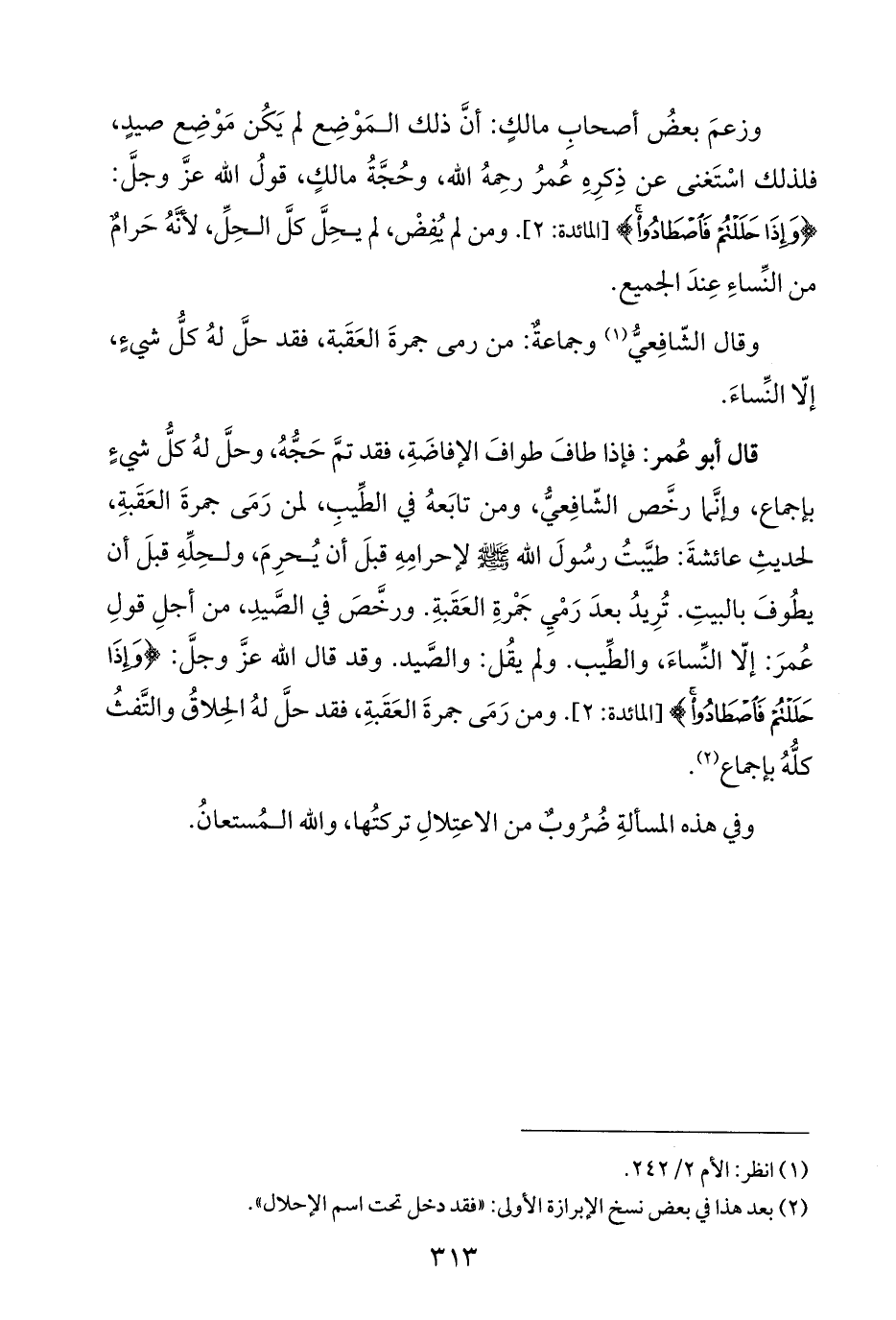 وزعمَ بعضُ أصحابِ مالكٍ: أنَّ ذلك المَوْضِع لم يَكُن مَوْضِع صيدٍ، فلذلك اسْتَغنى عن ذِكرِهِ عُمرُ رحِمهُ الله، وحُجَّةُ مالكٍ، قولُ الله عزَّ وجلَّ: {وَإِذَا حَلَلْتُمْ فَاصْطَادُوا} [المائدة: ٢]. ومن لم يُفِضْ، لم يحِلَّ كلَّ الحِلِّ، لأنَّهُ حَرامٌ من النِّساءِ عِندَ الجميع.