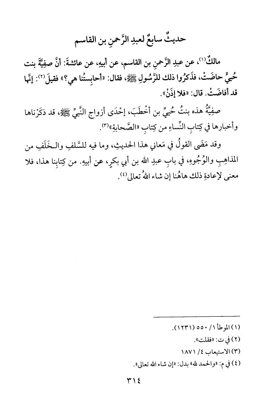 مالكٌ (¬١)، عن عبدِ الرَّحمن بن القاسم، عن أبيهِ، عن عائشةَ: أنَّ صفِيَّةَ بنت حُييٍّ حاضَتْ، فذَكرُوا ذلك للرَّسُولِ - صلى الله عليه وسلم -، فقال: "أحابِستُنا هي؟ " فقيلَ (¬٢): إنَّها قد أفاضَتْ. قال: "فلا إذَنْ".