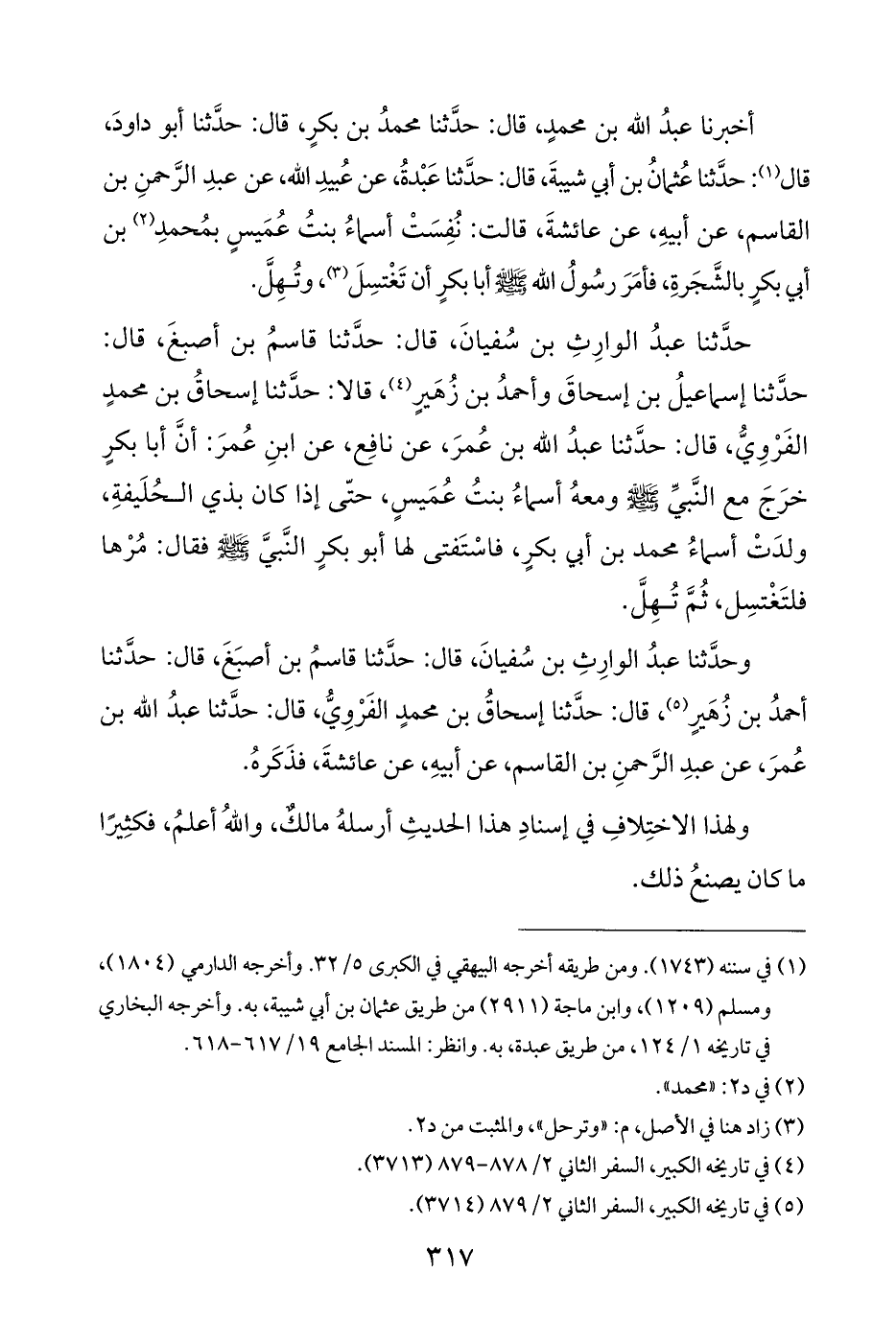 حدَّثنا عبدُ الوارِثِ بن سُفيانَ، قال: حدَّثنا قاسمُ بن أصبغَ، قال: حدَّثنا إسماعيلُ بن إسحاقَ وأحمدُ بن زُهَيرٍ (¬٤)، قالا: حدَّثنا إسحاقُ بن محمدٍ الفَرْوِيُّ، قال: حدَّثنا عبدُ الله بن عُمرَ، عن نافِع، عن ابنِ عُمرَ: أنَّ أبا بكرٍ خرَجَ مع النَّبيِّ - صلى الله عليه وسلم - ومعهُ أسماءُ بنتُ عُمَيسٍ، حتَّى إذا كان بذي الحُلَيفةِ، ولدَتْ أسماءُ محمد بن أبي بكرٍ، فاسْتَفتى لها أبو بكرٍ النَّبيَّ - صلى الله عليه وسلم - فقال: مُرْها فلتَغْتسِل، ثُمَّ تُهِلَّ.