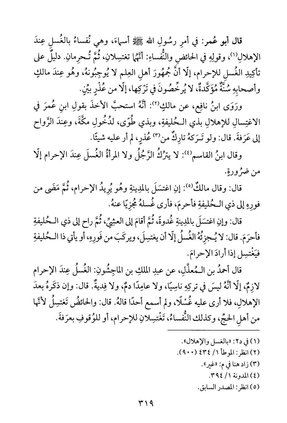 ورَوَى ابنُ نافِع، عن مالكٍ (¬٢): أنَّهُ استحبَّ الأخذَ بقولِ ابنِ عُمرَ في الاغتِسالِ للإهلالِ بذي الحُليفةِ، وبذي طُوًى، لدُخُولِ مكَّةَ، وعِندَ الرَّواح إلى عَرَفةَ. قال: ولو تَرَكهُ تارِكٌ من (¬٣) عُذرٍ، لم أر عليه شيئًا.