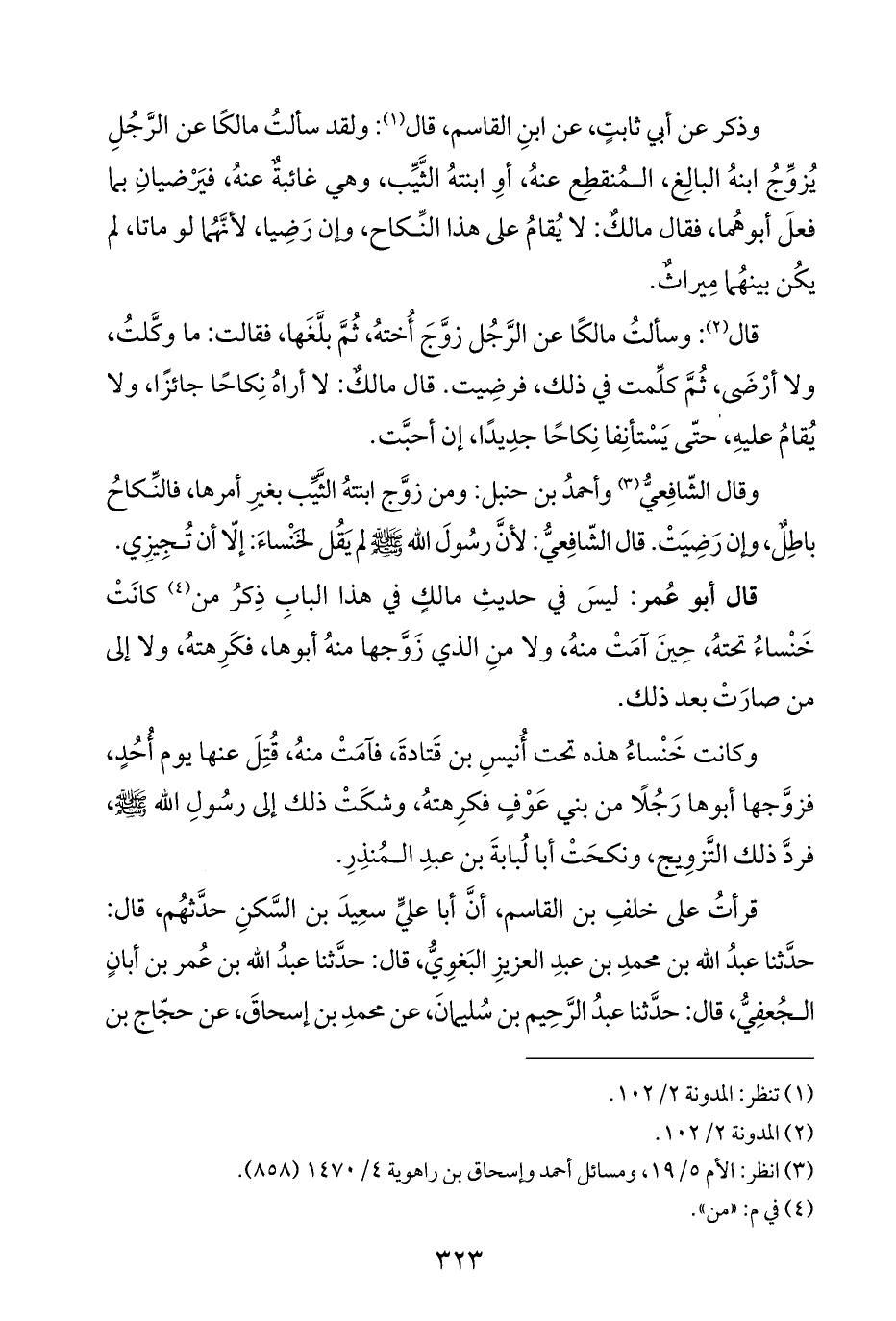 (¬٣) انظر: الأم ٥/ ١٩، ومسائل أحمد وإسحاق بن راهوية ٤/ ١٤٧٠ (٨٥٨).