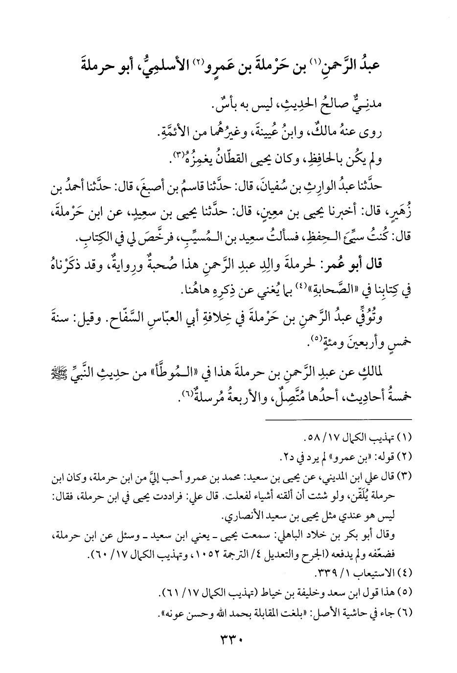 وقال أبو بكر بن خلاد الباهلي: سمعت يحيى - يعني ابن سعيد - وسئل عن ابن حرملة، فضعّفه ولم يدفعه (الجرح والتعديل ٤/ الترجمة ١٠٥٢، وتهذيب الكمال ١٧/ ٦٠).