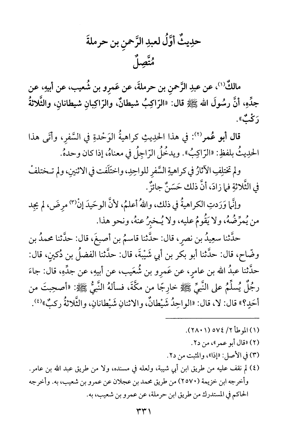 مالكٌ (¬١)، عن عبدِ الرَّحمنِ بن حرملةَ، عن عَمرِو بن شُعيب، عن أبيهِ، عن جدِّهِ، أنَّ رسُولَ الله - صلى الله عليه وسلم - قال: "الرّاكبُ شيطانٌ، والرّاكِبانِ شيطانانِ، والثَّلاثةُ رَكْبٌ".