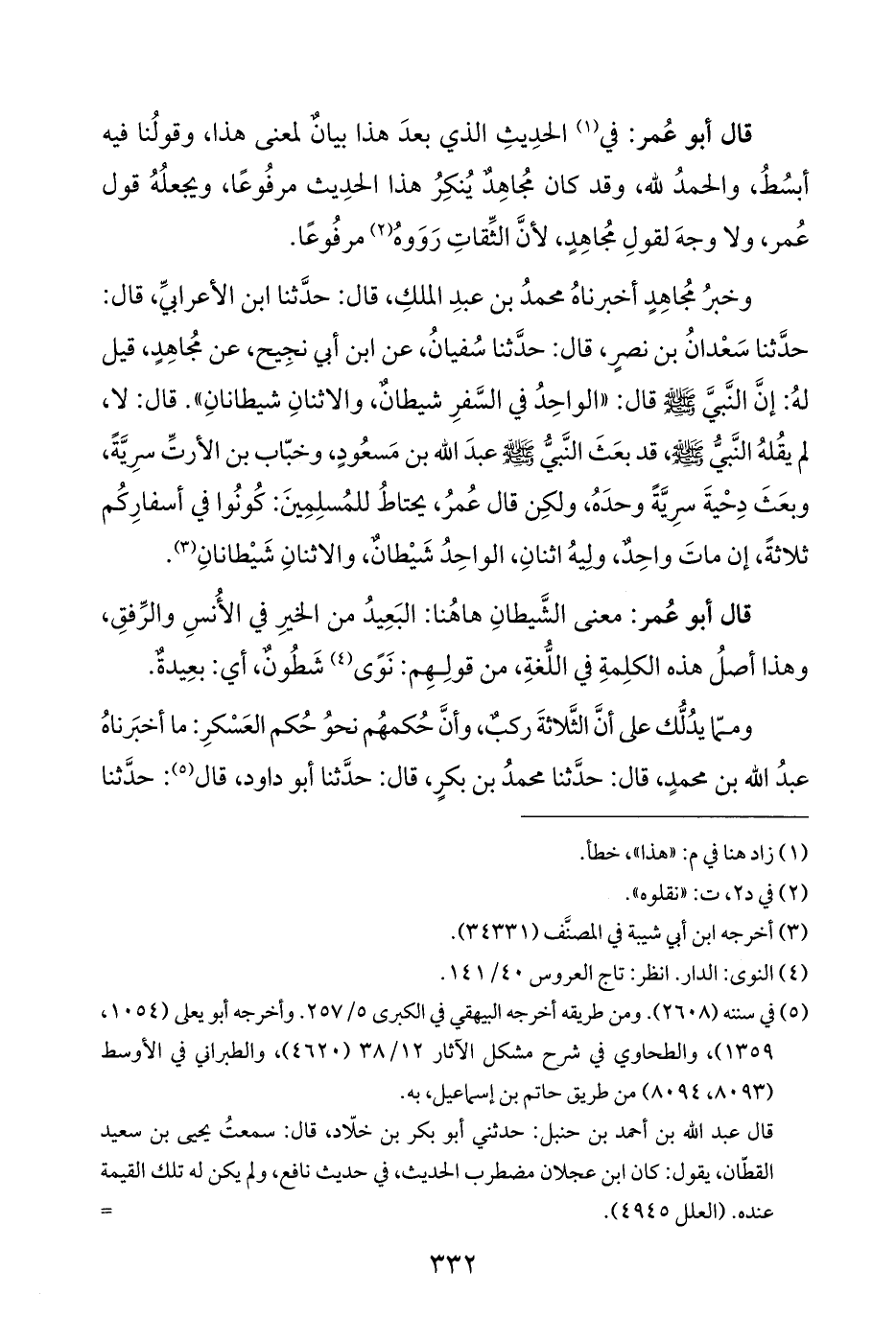 وخبرُ مُجاهِدٍ أخبرناهُ محمدُ بن عبدِ الملكِ، قال: حدَّثنا ابن الأعرابيِّ، قال: حدَّثنا سَعْدانُ بن نصرٍ، قال: حدَّثنا سُفيانُ، عن ابن أبي نجِيح، عن مُجاهِدٍ، قيل لهُ: إنَّ النَّبيَّ - صلى الله عليه وسلم - قال: "الواحِدُ في السَّفرِ شيطانٌ، والاثنانِ شيطانانِ". قال: لا، لم يقُلهُ النَّبيُّ - صلى الله عليه وسلم -، قد بعَثَ النَّبيُّ - صلى الله عليه وسلم - عبدَ الله بن مَسعُودٍ، وخبّاب بن الأرتِّ سرِيَّةً، وبعَثَ دِحْيةَ سرِيَّةً وحدَهُ، ولكِن قال عُمرُ، يحتاطُ للمُسلِمِينَ: كُونُوا في أسفارِكُم ثلاثةً، إن ماتَ واحِدٌ، ولِيهُ اثنانِ، الواحِدُ شَيْطانٌ، والاثنانِ شَيْطانانِ (¬٣).