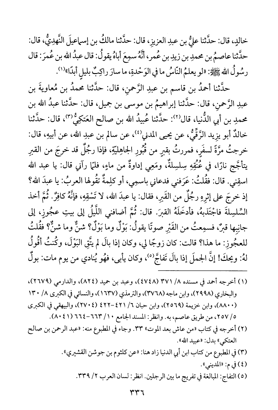 حدَّثنا أحمدُ بن قاسم بن عبدِ الرَّحمنِ، قال: حدَّثنا محمدُ بن مُعاويةَ بن عبدِ الرَّحمنِ، قال: حدَّثنا إبراهيمُ بن موسى بن جميل، قال: حدَّثنا عبدُ الله بن محمدِ بن أبي الدُّنيا، قال (¬٢): حدَّثنا عُبيدُ الله بن صالح العَتكِيُّ (¬٣)، قال: حدَّثنا خالدٌ أبو يزِيد الرَّقِّيُّ، عن يحيى المدني (¬٤)، عن سالم بن عبدِ الله، عن أبيهِ، قال: خرجت مرَّةً لسفرٍ، فمررت بقبرٍ من قُبُورِ الجاهِليةِ، فإذا رجُلٌ قد خرج من القبرِ يتأجَّج نارًا، في عُنُقِهِ سِلسِلة، ومَعِي إداوةٌ من ماءٍ، فلمّا رآني قال: يا عبد الله اسقِني. قال: فقُلتُ: عَرَفني فدعاني باسمِي، أو كلِمةٌ تقُولها العربُ: يا عبدَ الله؟ إذ خرجَ على إثرِهِ رجُلٌ من القَبرِ، فقال: يا عبدَ الله، لا تَسْقِهِ، فإنَّهُ كافِرٌ. ثُمَّ أخذ السِّلسِلةَ فاجْتَذبهُ، فأدخَلَهُ القبرَ. قال: ثُمَّ أضافني اللَّيلُ إلى بيتِ عجُوزٍ، إلى جانِبِها قبرٌ، فسمِعتُ من القَبْرِ صوتًا يقولُ: بَوْلٌ وما بَوْلٌ؟ شنٌّ وما شنٌّ؟ فقُلتُ للعجُوزِ: ما هذا؟ قالت: كان زوجًا لي، وكان إذا بالَ لم يتَّقِ البَوْلَ، وكُنتُ أقُولُ لهُ: ويحكَ! إنَّ الجملَ إذا بالَ تَفاجَّ (¬٥)، وكان يأبى، فهُو يُنادي من يوم مات: بولٌ