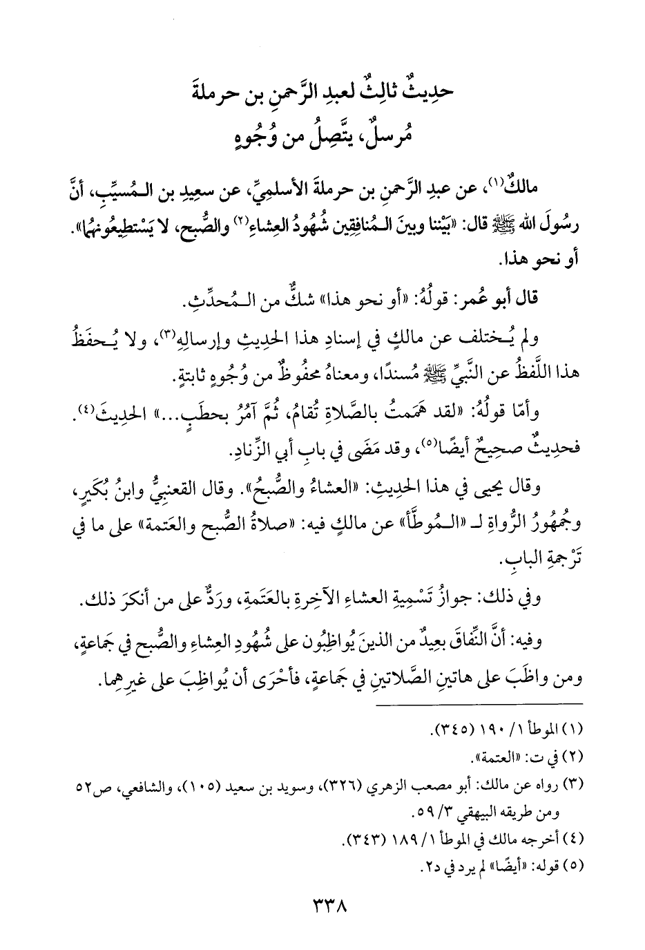 مالكٌ (¬١)، عن عبدِ الرَّحمنِ بن حرملةَ الأسلمِيِّ، عن سعِيدِ بن المُسيِّبِ، أنَّ رسُولَ الله - صلى الله عليه وسلم - قال: "بَيْننا وبينَ المُنافِقِين شُهُودُ العِشاءِ (¬٢) والصُّبح، لا يَسْتطِمعُونهُما". أو نحو هذا.