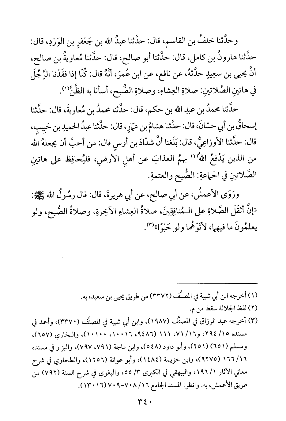 وحدَّثنا خلفُ بن القاسم، قال: حدَّثنا عبدُ الله بن جَعْفرِ بن الوَرْدِ، قال: حدَّثنا هارونُ بن كامل، قال: حدَّثنا أبو صالح، قال: حدَّثنا مُعاويةُ بن صالح، أنَّ يحيى بن سعِيدٍ حدَّثهُ، عن نافع، عن ابن عُمرَ، أنَّهُ قال: كُنّا إذا فقَدْنا الرَّجُلَ في هاتينِ الصَّلاتينِ: صلاةِ العِشاءِ، وصلاةِ الصُّبح، أسأنا به الظَّنَّ (¬١).