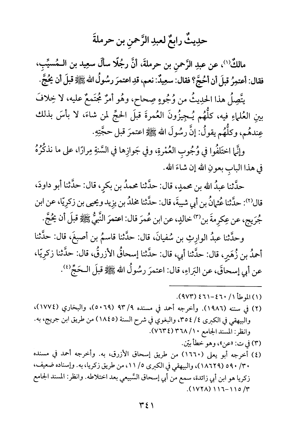 وحدَّثنا عبدُ الوارِثِ بن سُفيانَ، قال: حدَّثنا قاسمُ بن أصبغَ، قال: حدَّثنا أحمدُ بن زُهَيرٍ، قال: حدَّثنا أبي، قال: حدَّثنا إسحاقُ الأزرقُ، قال: حدَّثنا زكرِيّا، عن أبي إسحاقَ، عن البَراءِ، قال: اعتمرَ رسُولُ الله - صلى الله عليه وسلم - قبلَ الحَجِّ (¬٤).
