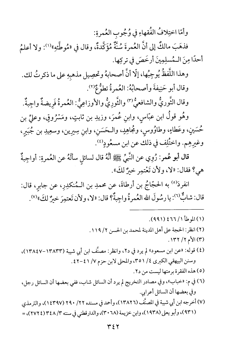 قال أبو عُمر: رُوِي عن النَّبيِّ - صلى الله عليه وسلم - أَنَّهُ قال لسائلٍ سألَهُ عن العُمرةِ: أواجِبةٌ هي؟ فقال: "لا، ولأن تَعْتمِر خيرٌ لكَ".