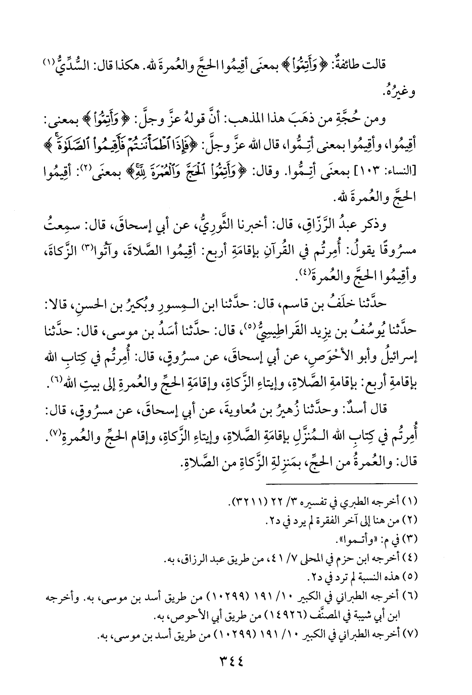 حدَّثنا خلَفُ بن قاسم، قال: حدَّثنا ابن المِسورِ وبُكيرُ بن الحسنِ، قالا: حدَّثنا يُوسُفُ بن يزِيد القَراطِيسِيُّ (¬٥)، قال: حدَّثنا أسَدُ بن موسى، قال: حدَّثنا إسرائيلُ وأبو الأحْوَصِ، عن أبي إسحاقَ، عن مسرُوقٍ، قال: أُمِرتُم في كِتابِ الله بإقامةِ أربع: بإقامةِ الصَّلاةِ، وإيتاءِ الزَّكاةِ، وإقامَةِ الحجِّ والعُمرةِ إلى بيتِ الله (¬٦).