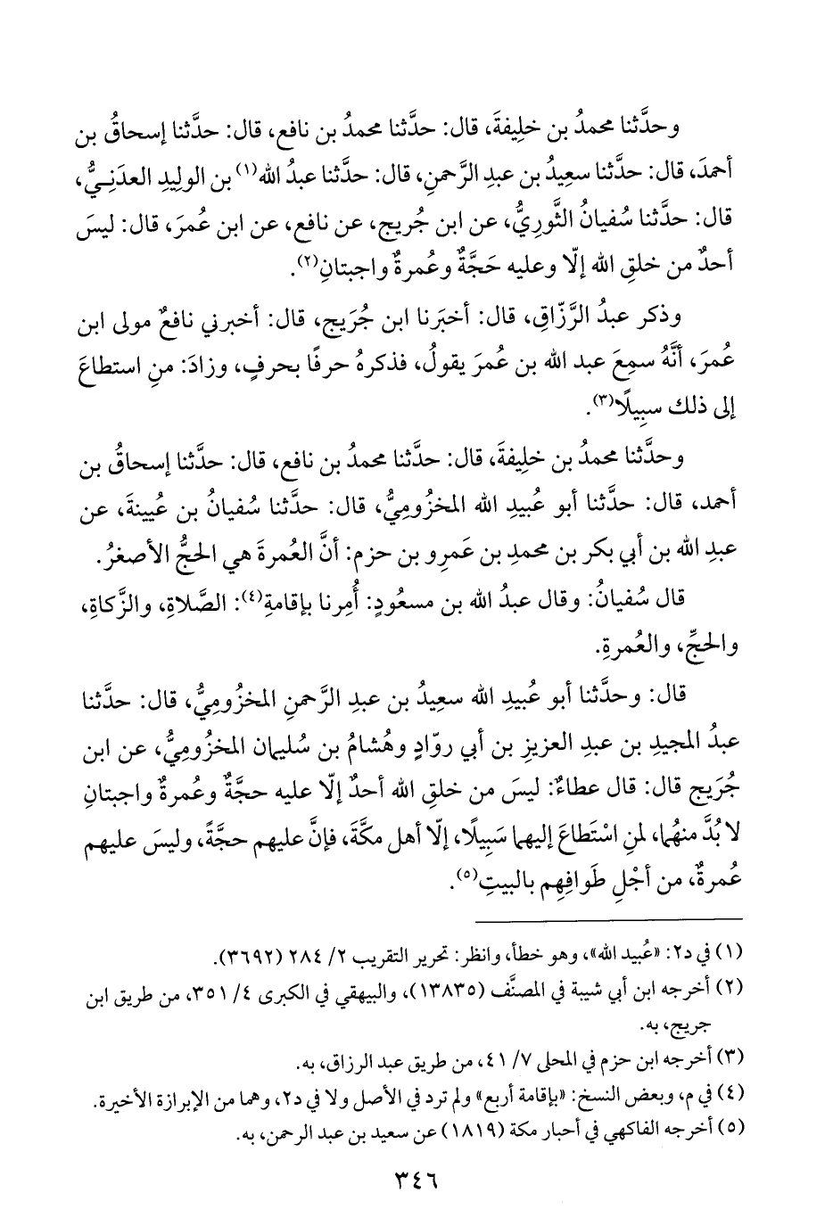 قال: وحدَّثنا أبو عُبيدِ الله سعِيدُ بن عبدِ الرَّحمنِ المخزُومِيُّ، قال: حدَّثنا عبدُ المجيدِ بن عبدِ العزيزِ بن أبي روّادٍ وهُشامُ بن سُليمان المخزُومِيُّ، عن ابن جُرَيج قال: قال عطاءٌ: ليسَ من خلقِ الله أحدٌ إلّا عليه حجَّةٌ وعُمرةٌ واجبتانِ لا بُدَّ منهُما، لمنِ اسْتَطاعَ إليهما سَبِيلًا، إلّا أهل مكَّةَ، فإنَّ عليهم حجَّةً، وليسَ عليهم عُمرةٌ، من أجْلِ طَوافِهِم بالبيتِ (¬٥).