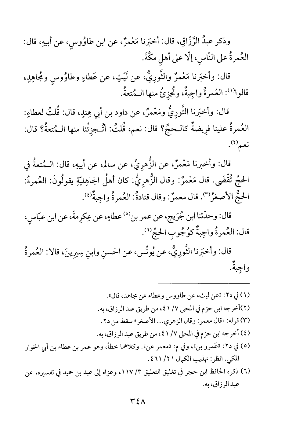 قال: وأخبَرنا الثَّورِيُّ ومَعْمرٌ، عن داود بن أبي هِندٍ، قال: قُلتُ لعطاءٍ: العُمرةُ علينا فرِيضةٌ كالحجِّ؟ قال: نعم، قُلتُ: أتُجزِئُنا منها المُتعةُ؟ قال: نعم (¬٢).