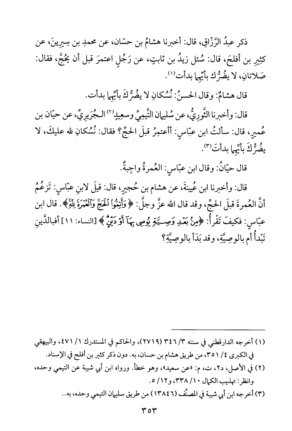 قال: وأخبرنا الثَّورِيُّ، عن سُليمان التَّيمِيِّ وسعِيدٍ (¬٢) الجُرَيرِيِّ، عن حيّان بن عُميرٍ، قال: سألتُ ابن عبّاسٍ: أأعتمِرُ قبلَ الحجِّ؟ فقال: نُسُكانِ لله عليكَ، لا يضُرُّكَ بأيِّهِما بدأتَ (¬٣).