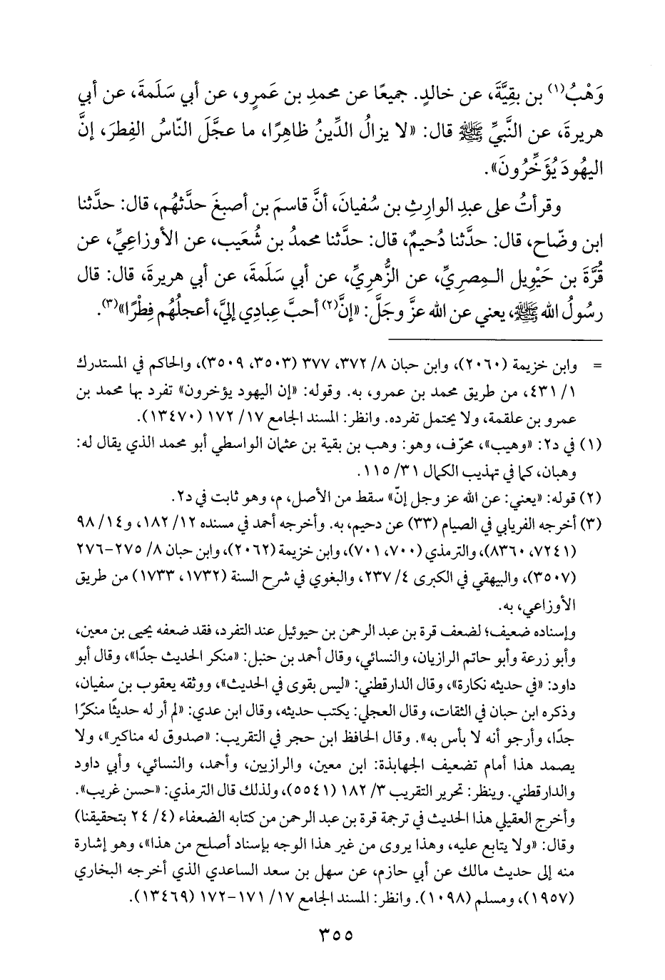 وَهْبُ (¬١) بن بقِيَّةَ، عن خالدٍ. جميعًا عن محمدِ بن عَمرٍو، عن أبي سَلَمةَ، عن أبي هريرةَ، عن النَّبيِّ - صلى الله عليه وسلم - قال: "لا يزالُ الدِّينُ ظاهِرًا، ما عجَّلَ النّاسُ الفِطرَ، إنَّ اليهُودَ يُؤَخِّرُونَ".