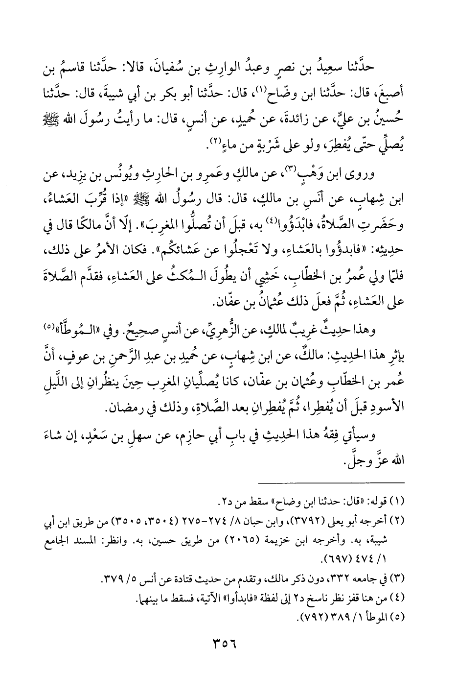حدَّثنا سعِيدُ بن نصرٍ وعبدُ الوارِثِ بن سُفيانَ، قالا: حدَّثنا قاسمُ بن أصبغَ، قال: حدَّثنا ابن وضّاح (¬١)، قال: حدَّثنا أبو بكر بن أبي شيبةَ، قال: حدَّثنا حُسينُ بن عليٍّ، عن زائدةَ، عن حُميدٍ، عن أنسٍ، قال: ما رأيتُ رسُولَ الله - صلى الله عليه وسلم - يُصلِّي حتَّى يُفطِرَ، ولو على شَرْبةٍ من ماءٍ (¬٢).