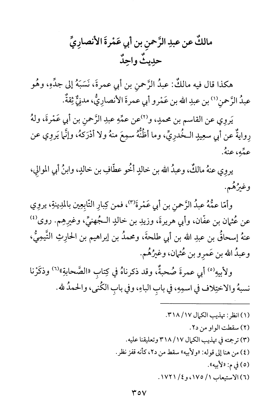 هكذا قال فيه مالكٌ: عبدُ الرَّحمنِ بن أبي عمرةَ، نَسَبَهُ إلى جدِّهِ، وهُو عبدُ الرَّحمنِ (¬١) بن عبدِ الله بن عَمْرو أبي عمرةَ الأنصارِيُّ، مدنِيٌّ ثِقةٌ.