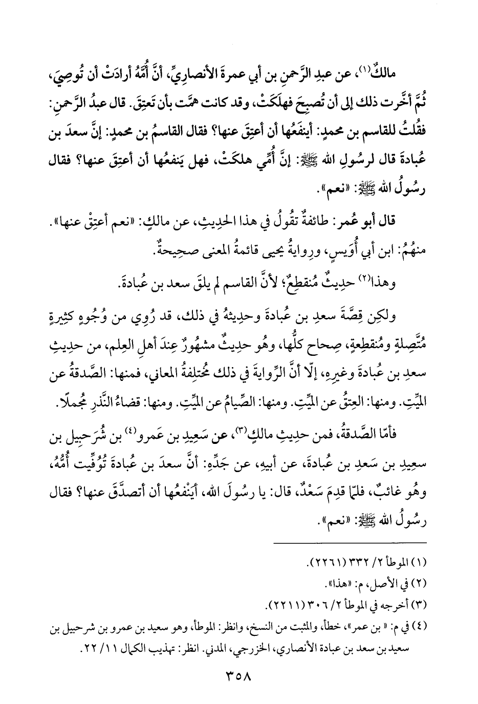 مالكٌ (¬١)، عن عبدِ الرَّحمنِ بن أبي عمرةَ الأنصارِيِّ، أنَّ أُمَّهُ أرادَتْ أن تُوصِيَ، ثُمَّ أخَّرت ذلك إلى أن تُصبِحَ فهلكَتْ، وقد كانت همَّت بأن تَعتِقَ. قال عبدُ الرَّحمنِ: فقُلتُ للقاسم بن محمدٍ: أينفَعُها أن أعتِقَ عنها؟ فقال القاسمُ بن محمدٍ: إنَّ سعدَ بن عُبادةَ قال لرسُولِ الله - صلى الله عليه وسلم -: إنَّ أُمِّي هلكَتْ، فهل يَنفعُها أن أعتِقَ عنها؟ فقال رسُولُ الله - صلى الله عليه وسلم -: "نعم".