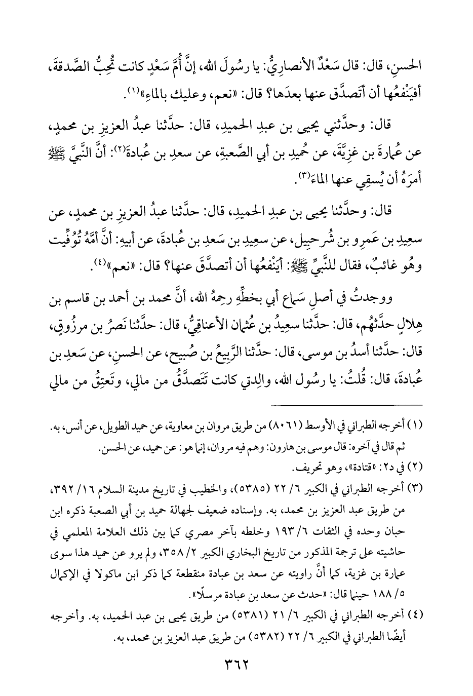 (¬٣) أخرجه الطبراني في الكبير ٦/ ٢٢ (٥٣٨٥)، والخطيب في تاريخ مدينة السلام ١٦/ ٣٩٢، من طريق عبد العزيز بن محمد، به. وإسناده ضعيف لجهالة حميد بن أبي الصعبة ذكره ابن حبان وحده في الثقات ٦/ ١٩٣ وخلطه بآخر مصري كما بين ذلك العلامة المعلمي في حاشيته على ترجمة المذكور من تاريخ البخاري الكبير ٢/ ٣٥٨، ولم يرو عن حميد هذا سوى عمارة بن غزية، كما أنَّ راويته عن سعد بن عبادة منقطعة كما ذكر ابن ماكولا في الإكمال ٥/ ١٨٨ حينما قال: "حدث عن سعد بن عبادة مرسلًا".