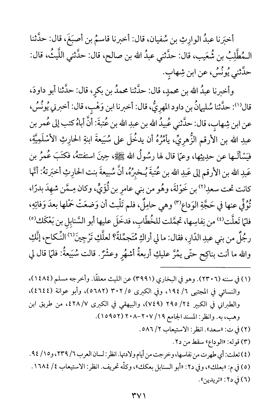 وأخبرنا عبدُ الله بن محمدٍ، قال: حدَّثنا محمدُ بن بكرٍ، قال: حدَّثنا أبو داودَ، قال (¬١): حدَّثنا سُليمانُ بن داود المهرِيُّ، قال: أخبرنا ابن وَهْبِ، قال: أخبرني يُونُسُ، عن ابن شِهابٍ، قال: حدَّثني عُبيدُ الله بن عبدِ الله بن عُتبةَ: أَنَّ أباهُ كتب إلى عُمر بن عبدِ الله بن الأرقم الزُّهرِيِّ، يأمُرُهُ أن يدخُلَ على سُبَيعةَ ابنةِ الحارِثِ الأسْلَمِيَّةِ، فيَسْألَها عن حدِيثِها، وعمّا قال لها رسُولُ الله - صلى الله عليه وسلم -، حِينَ استفتتهُ، فكتَبَ عُمرُ بن عَبدِ الله بن الأرقم إلى عَبدِ الله بن عُتبةَ يُخبِرُهُ، أنَّ سُبيعةَ بنت الحارِثِ أخبَرتهُ: أنَّها كانت تحت سعدِ (¬٢) بن خَوْلةَ، وهُو من بني عامرِ بن لُؤَيِّ، وكان مِمَّن شهِدَ بدرًا، تُوُفِّي عنها في حَجَّةِ الوَداع (¬٣) وهي حامِلٌ، فلم تَلْبث أن وَضعَتْ حَمْلها بعدَ وَفاتِهِ، فلمّا تَعلَّت (¬٤) من نِفاسِها، تجمَّلت للخُطّابِ، فدخَلَ عليها أبو السَّنابِلِ بن بَعْكَك (¬٥) رجُلٌ من بني عبدِ الدّارِ، فقال: ما لي أراكِ مُتَجمِّلةً؟ لعلَّكِ تَرْجِينَ (¬٦) النِّكاح، إنَّكِ والله ما أنت بناكِح حتَّى يمُرَّ عليكِ أربعةُ أشهُرٍ وعشْرٌ. قالت سُبَيعةُ: فلمّا قال لي