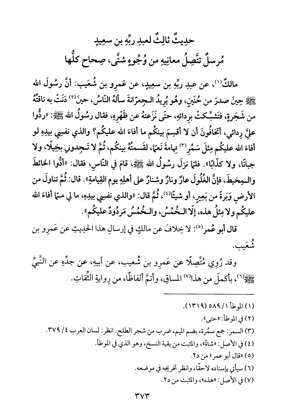 مالكٌ (¬١)، عن عبدِ ربِّهِ بن سعِيدٍ، عن عَمرِو بن شُعَيب: أنَّ رسُولَ الله - صلى الله عليه وسلم - حِينَ صدرَ من حُنَينٍ، وهُو يُرِيدُ الجِعرّانةَ سألهُ النّاسُ، حينَ (¬٢) دَنَتْ به ناقتُهُ من شَجَرةٍ، فتَشبَّكتْ برِدائهِ، حتَّى نَزَعتهُ عن ظَهْرِهِ، فقال رسُولُ الله - صلى الله عليه وسلم -: "ردُّوا عليَّ رِدائي، أتخافُونَ أن لا أقسِمَ بينكُم ما أفاءَ الله عليكُم؟ والذي نفسِي بيدِهِ لو أفاءَ الله عليكُم مِثلَ سَمُرِ (¬٣) تِهامةَ نَعمًا، لقَسمتُهُ بينكُم، ثُمَّ لا تَجِدوني بخِيلًا، ولا جبانًا، ولا كذّابًا". فلمّا نزلَ رسُولُ الله - صلى الله عليه وسلم -، قامَ في النّاسِ، فقال: "أدُّوا الخائطَ والمِخيطَ، فإنَّ الغُلُولَ عارٌ ونارٌ وشنارٌ على أهلِهِ يوم القِيامةِ". قال: ثُمَّ تناولَ من الأرضِ وَبَرةً من بَعِيرٍ، أو شيئًا (¬٤)، ثُمَّ قال: "والذي نفسِي بيدِهِ، ما لي ممّا أفاءَ الله عليكُم ولا مِثلُ هذه، إلّا الخُمُسُ، والخُمُسُ مَردُودٌ عليكُم".