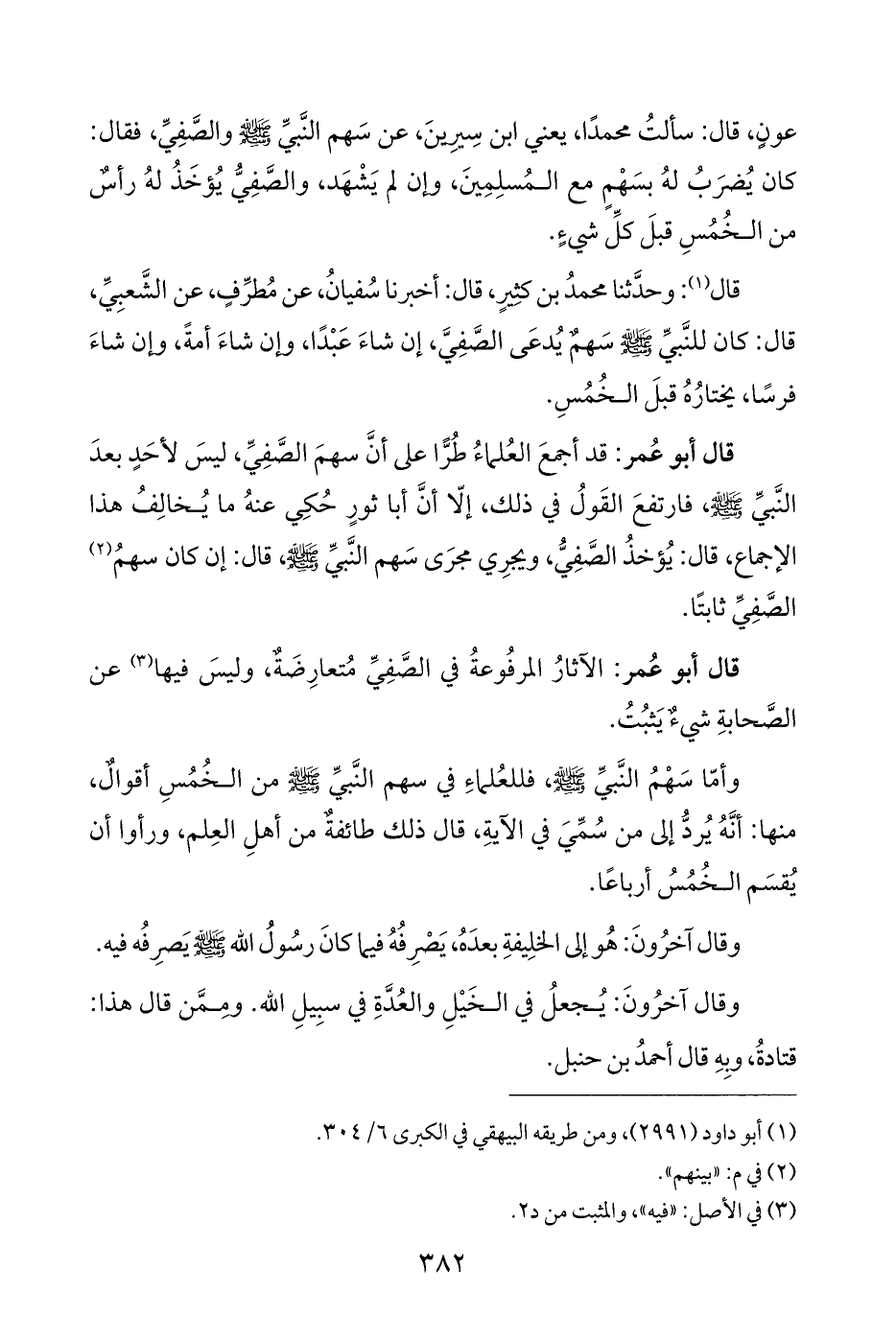 عونٍ، قال: سألتُ محمدًا، يعني ابن سِيرِينَ، عن سَهم النَّبيِّ - صلى الله عليه وسلم - والصَّفِيِّ، فقال: كان يُضرَبُ لهُ بسَهْمٍ مع المُسلِمِينَ، وإن لم يَشْهَد، والصَّفِيُّ يُؤخَذُ لهُ رأسٌ من الخُمُسِ قبلَ كلِّ شيءٍ.