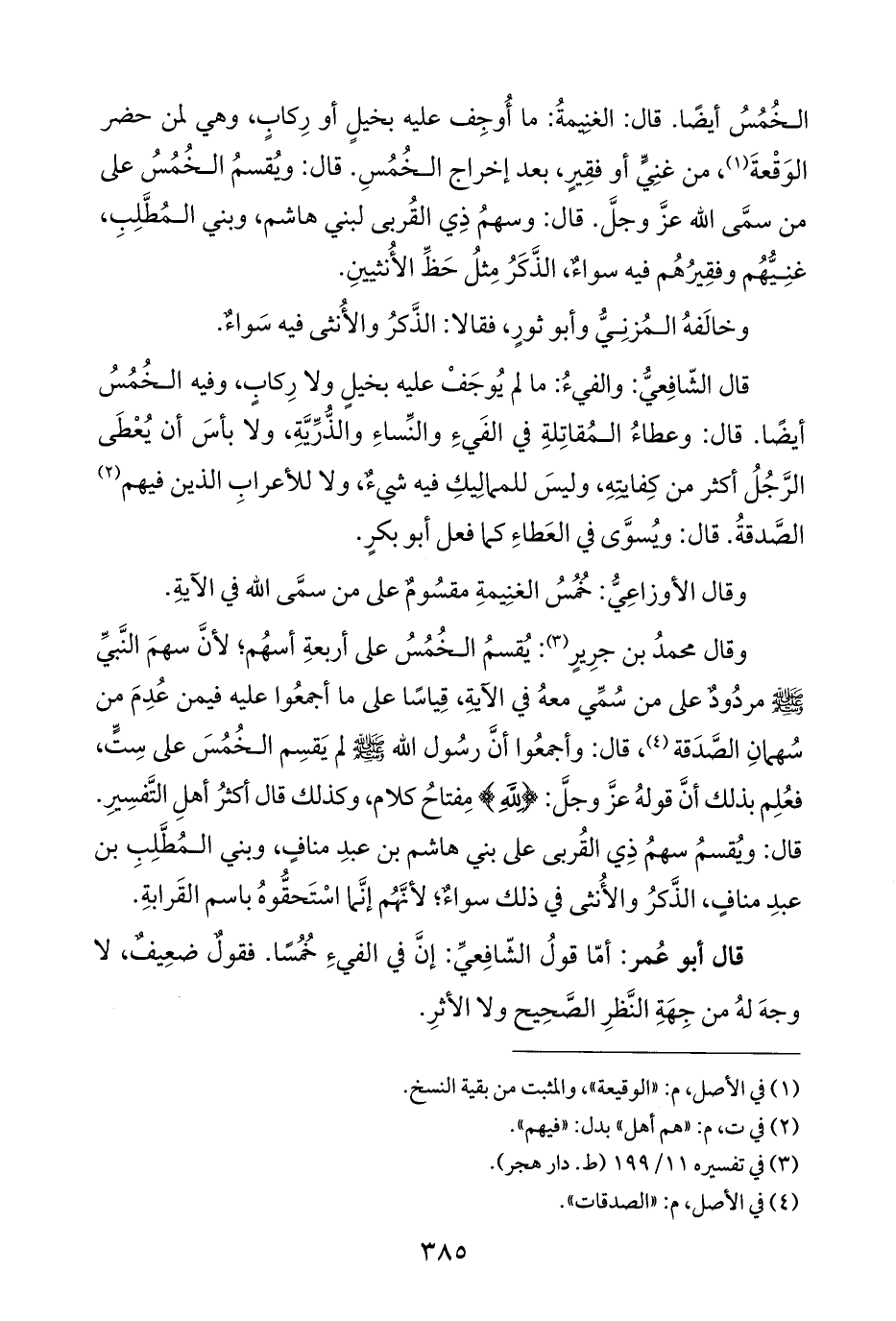 وقال محمدُ بن جرِيرٍ (¬٣): يُقسمُ الخُمُسُ على أربعةِ أسهُم؛ لأنَّ سهمَ النَّبيِّ - صلى الله عليه وسلم - مردُودٌ على من سُمِّي معهُ في الآيةِ، قِياسًا على ما أجمعُوا عليه فيمن عُدِمَ من سُهمانِ الصَّدَقة (¬٤)، قال: وأجمعُوا أنَّ رسُول الله - صلى الله عليه وسلم - لم يَقسِم الخُمُسَ على سِتٍّ، فعُلِم بذلك أنَّ قولهُ عزَّ وجلَّ: {لِلَّهِ} مِفتاحُ كلام، وكذلك قال أكثرُ أهلِ التَّفسِيرِ. قال: ويُقسمُ سهمُ ذِي القُربى على بني هاشم بن عبدِ منافٍ، وبني المُطَّلِبِ بن عبدِ منافٍ، الذَّكرُ والأُنثى في ذلك سواءٌ؛ لأنَّهُم إنَّما اسْتَحقُّوهُ باسم القَرابةِ.