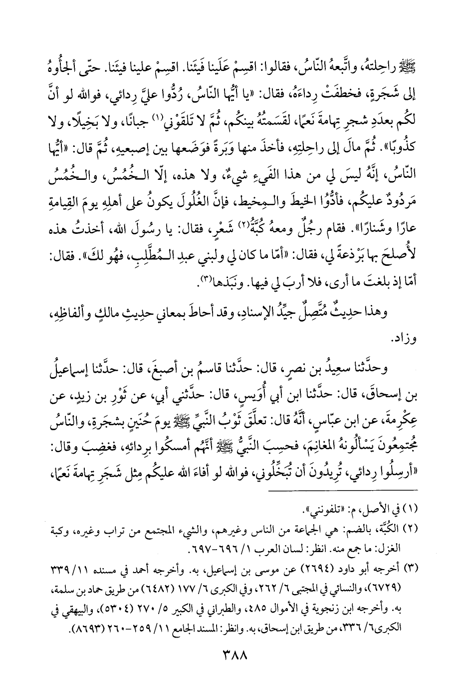 وحدَّثنا سعِيدُ بن نصرٍ، قال: حدَّثنا قاسمُ بن أصبغَ، قال: حدَّثنا إسماعيلُ بن إسحاقَ، قال: حدَّثنا ابن أبي أُوَيسٍ، قال: حدَّثني أبي، عن ثَوْرِ بن زيدٍ، عن عِكْرِمةَ، عن ابن عبّاسٍ، أنَّهُ قال: تعلَّقَ ثَوْبُ النَّبيِّ - صلى الله عليه وسلم - يومَ حُنَينٍ بشجَرةِ، والنّاسُ مُجتمِعُونَ يَسْألُونهُ المغانِمَ، فحسِبَ النَّبيُّ - صلى الله عليه وسلم - أنَّهُم أمسكُوا برِدائهِ، فغضِبَ وقال: "أرسِلُوا رِدائي، تُرِيدُونَ أن تُبَخِّلُوني، فوالله لو أفاءَ الله عليكُم مِثل شجَرِ تِهامةَ نَعمًا،