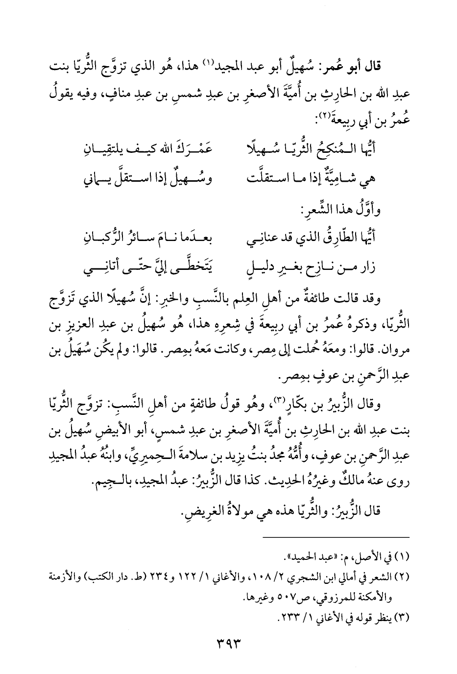 قال أبو عُمر: سُهيلٌ أبو عبد المجيد (¬١) هذا، هُو الذي تزوَّج الثُّريّا بنت عبدِ الله بن الحارِثِ بن أُميَّةَ الأصغرِ بن عبدِ شمسِ بن عبدِ منافٍ، وفيه يقولُ عُمرُ بن أبي ربِيعةَ (¬٢):