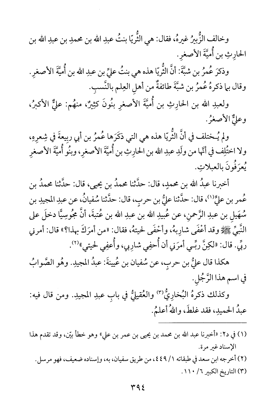 وخالف الزُّبيرُ غيرهُ، فقال: هي الثُّريّا بنتُ عبدِ الله بن محمدِ بن عبدِ الله بن الحارِثِ بن أُميَّةَ الأصغرِ.