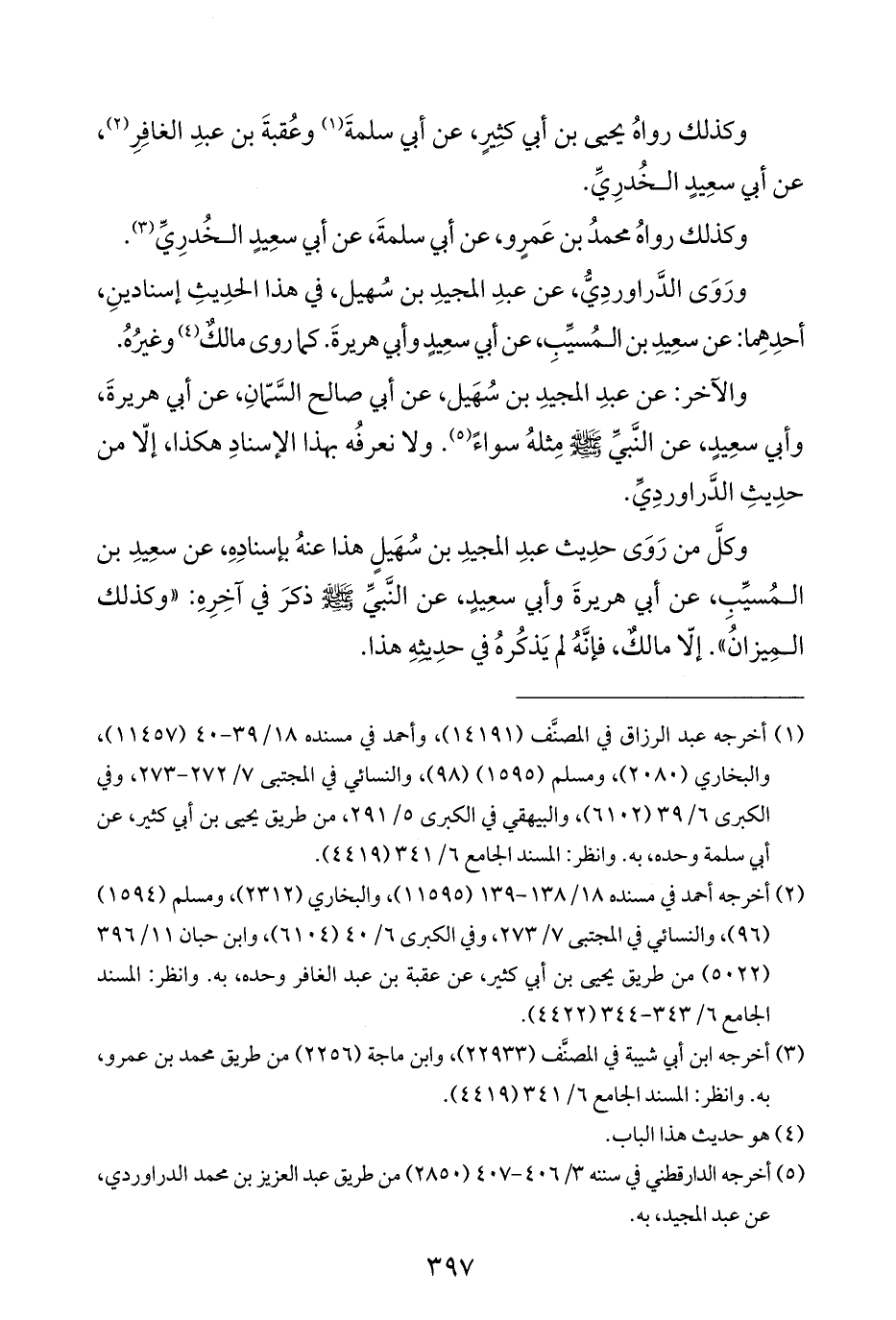 ورَوَى الدَّراوردِيُّ، عن عبدِ المجيدِ بن سُهيل، في هذا الحدِيثِ إسنادينِ، أحدِهِما: عن سعِيدِ بن المُسيِّبِ، عن أبي سعِيدٍ وأبي هريرةَ. كما روى مالكٌ (¬٤) وغيرُهُ.