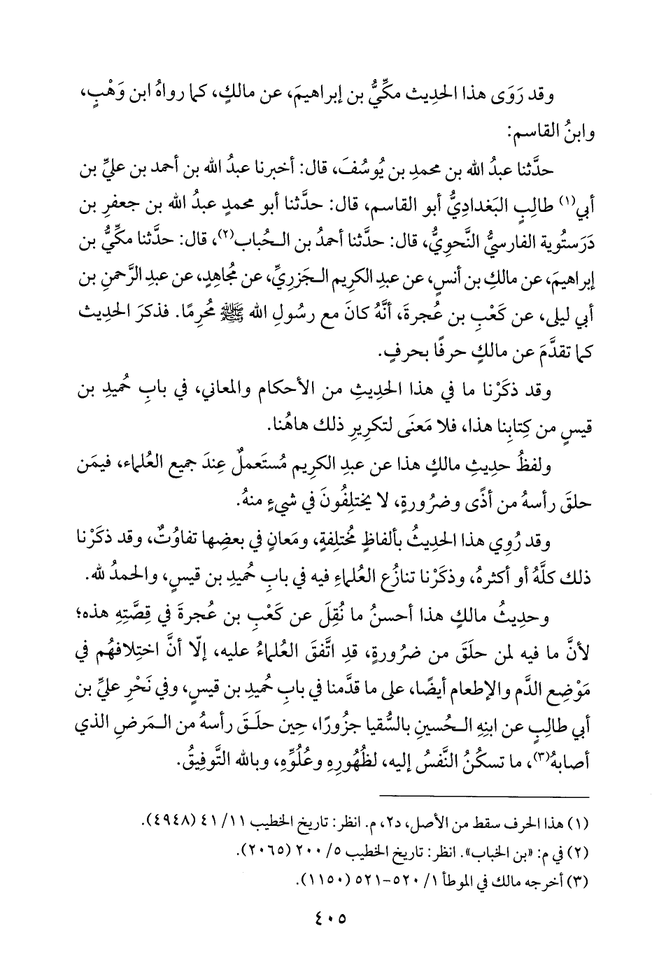 ولفظُ حدِيثِ مالكٍ هذا عن عبدِ الكرِيم مُستَعملٌ عِندَ جميع العُلماء، فيمَن حلقَ رأسهُ من أذًى وضرُورةٍ، لا يختلِفُونَ في شيءٍ منهُ.