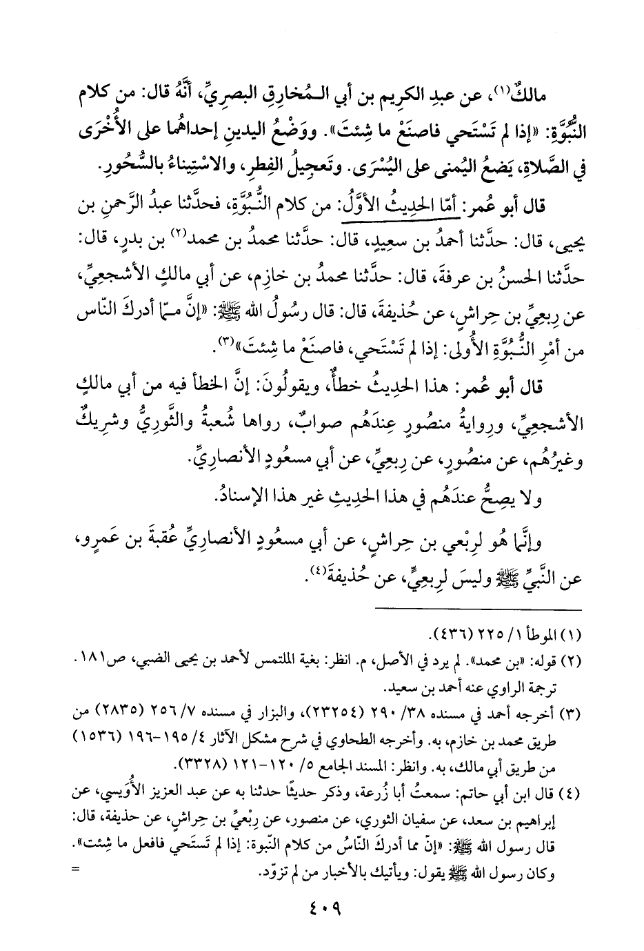 قال أبو عُمر: أمّا الحدِيثُ الأوَّلُ: من كلام النُّبُوَّةِ، فحدَّثنا عبدُ الرَّحمنِ بن يحيى، قال: حدَّثنا أحمدُ بن سعِيدٍ، قال: حدَّثنا محمدُ بن محمد (¬٢) بن بدرٍ، قال: حدَّثنا الحسنُ بن عرفةَ، قال: حدَّثنا محمدُ بن خازِم، عن أبي مالكٍ الأشجعِيِّ، عن رِبعِيِّ بن حِراشٍ، عن حُذيفةَ، قال: قال رسُولُ اللَّه -صلى اللَّه عليه وسلم-: "إنَّ ممّا أدركَ النّاس من أمْرِ النُّبُوَّةِ الأُولى: إذا لم تَسْتَحي، فاصنَعْ ما شِئتَ" (¬٣).