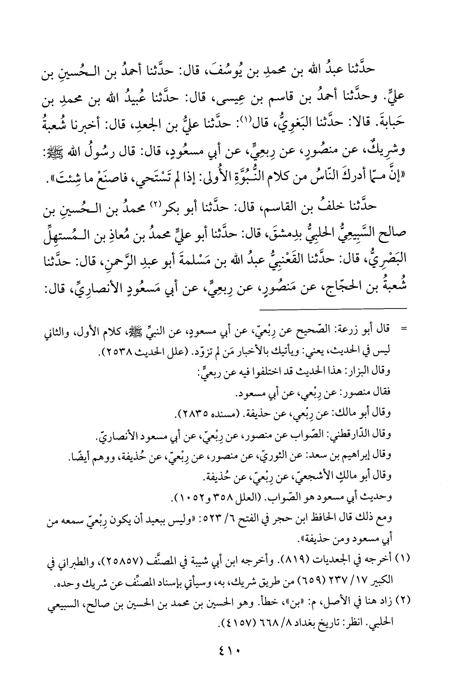 حدَّثنا عبدُ اللَّه بن محمدِ بن يُوسُفَ، قال: حدَّثنا أحمدُ بن الحُسينِ بن عليٍّ. وحدَّثنا أحمدُ بن قاسم بن عِيسى، قال: حدَّثنا عُبيدُ اللَّه بن محمدِ بن حَبابةَ. قالا: حدَّثنا البَغوِيُّ، قال (¬١): حدَّثنا عليُّ بن الجعدِ، قال: أخبرنا شُعبةُ وشرِيكٌ، عن منصُورٍ، عن رِبعِيٍّ، عن أبي مسعُودٍ، قال: قال رسُولُ اللَّه -صلى اللَّه عليه وسلم-: "إنَّ ممّا أدركَ النّاسُ من كلام النُّبُوَّةِ الأُولى: إذا لم تَسْتَحي، فاصنَعْ ما شِئتَ".