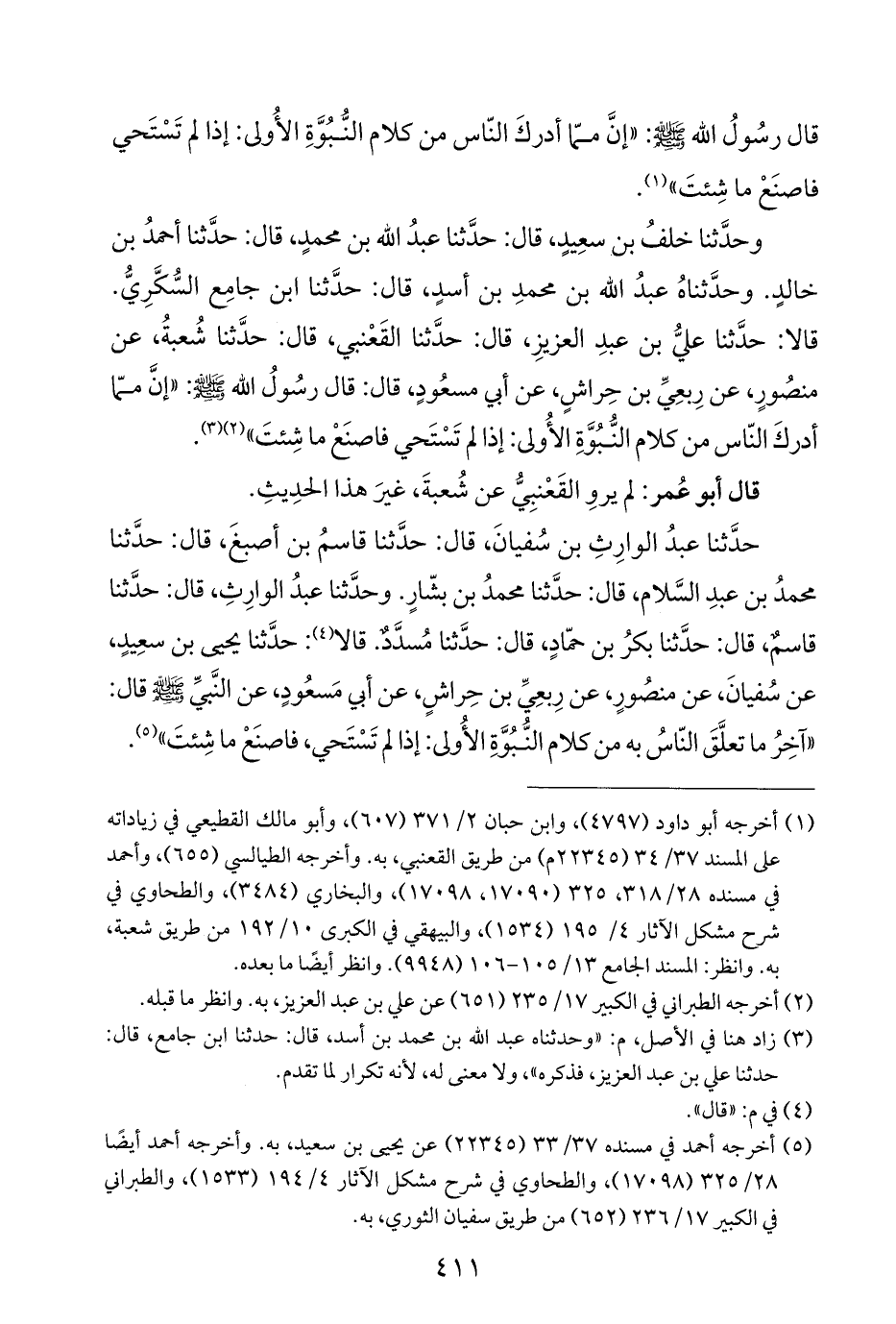 حدَّثنا عبدُ الوارِثِ بن سُفيانَ، قال: حدَّثنا قاسمُ بن أصبغَ، قال: حدَّثنا محمدُ بن عبدِ السَّلام، قال: حدَّثنا محمدُ بن بشّارٍ. وحدَّثنا عبدُ الوارِثِ، قال: حدَّثنا قاسمٌ، قال: حدَّثنا بكرُ بن حمّادٍ، قال: حدَّثنا مُسدَّدٌ. قالا (¬٤): حدَّثنا يحيى بن سعِيدٍ، عن سُفيانَ، عن منصُورٍ، عن رِبعِيِّ بن حِراشٍ، عن أبي مَسعُودٍ، عن النَّبيِّ -صلى اللَّه عليه وسلم- قال: "آخِرُ ما تعلَّقَ النّاسُ به من كلام النُّبُوَّةِ الأُولى: إذا لم تَسْتَحي، فاصنَعْ ما شِئتَ" (¬٥).