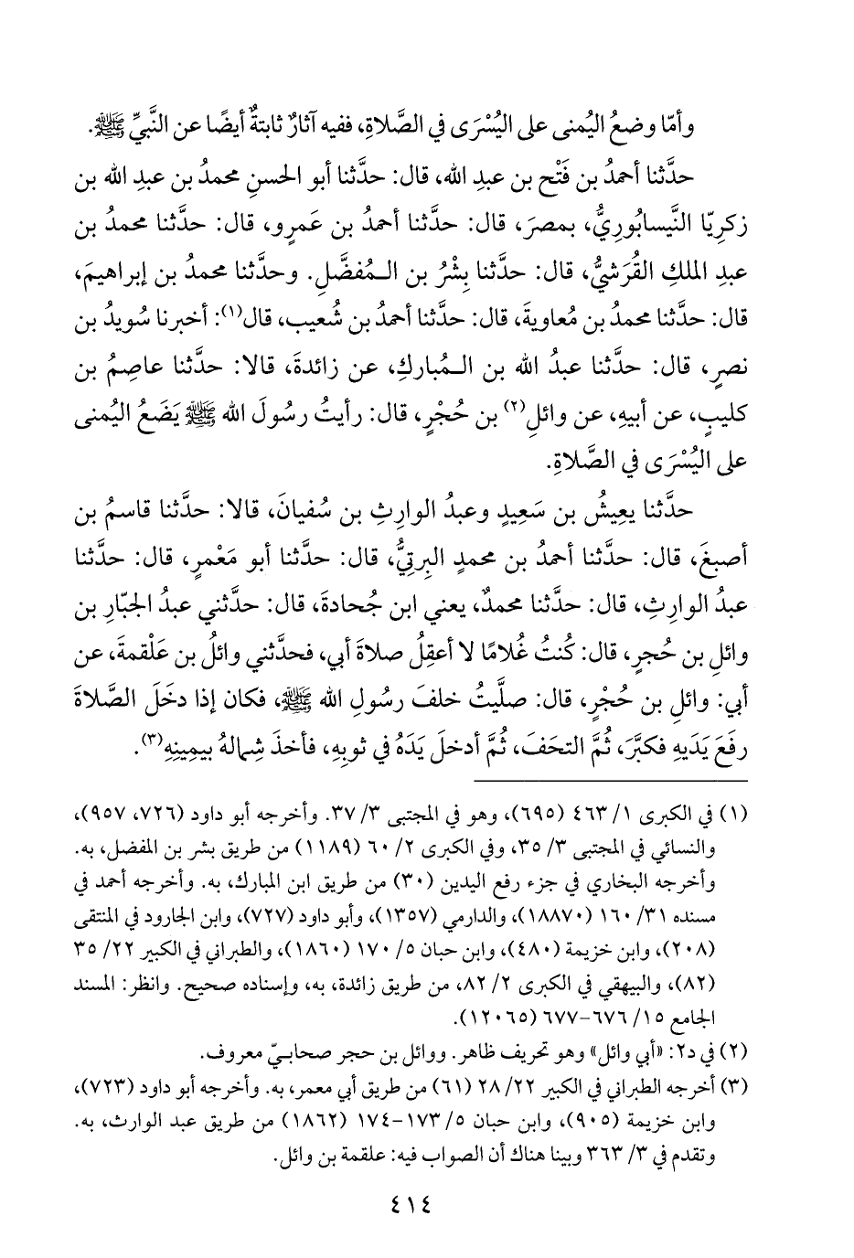 حدَّثنا أحمدُ بن فَتْح بن عبدِ اللَّه، قال: حدَّثنا أبو الحسنِ محمدُ بن عبدِ اللَّه بن زكرِيّا النَّيسابُورِيُّ، بمصرَ، قال: حدَّثنا أحمدُ بن عَمرٍو، قال: حدَّثنا محمدُ بن عبدِ الملكِ القُرَشيُّ، قال: حدَّثنا بِشْرُ بن المُفضَّلِ. وحدَّثنا محمدُ بن إبراهيمَ، قال: حدَّثنا محمدُ بن مُعاويةَ، قال: حدَّثنا أحمدُ بن شُعيب، قال (¬١): أخبرنا سُويدُ بن نصرٍ، قال: حدَّثنا عبدُ اللَّه بن المُباركِ، عن زائدةَ، قالا: حدَّثنا عاصِمُ بن كليبٍ، عن أبيهِ، عن وائلِ (¬٢) بن حُجْرٍ، قال: رأيتُ رسُولَ اللَّه -صلى اللَّه عليه وسلم- يَضَحُ اليُمنى على اليُسْرَى في الصَّلاةِ.
