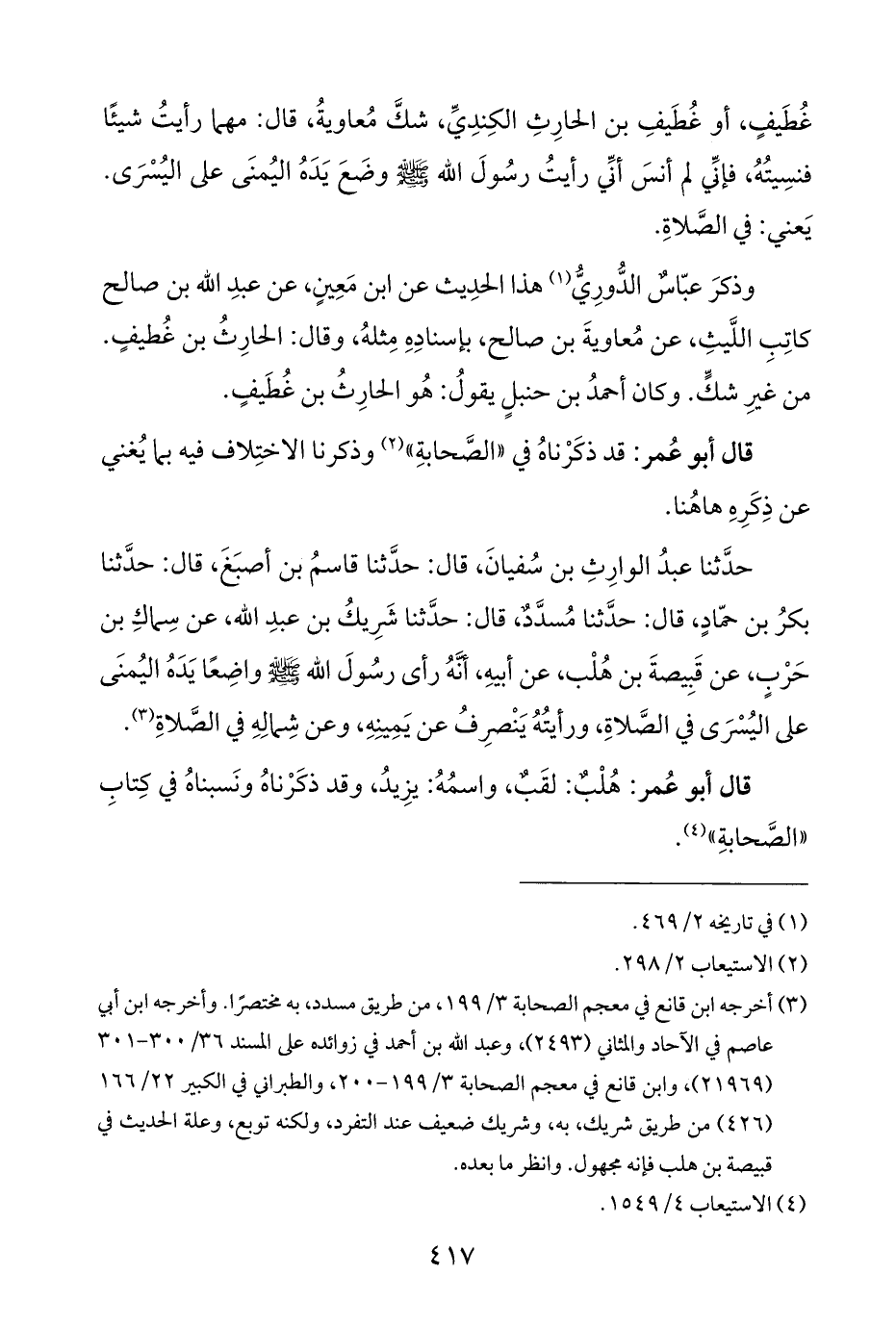 حدَّثنا عبدُ الوارِثِ بن سُفيانَ، قال: حدَّثنا قاسمُ بن أصبَغَ، قال: حدَّثنا بكرُ بن حمّادٍ، قال: حدَّثنا مُسدَّدٌ، قال: حدَّثنا شَرِيكُ بن عبدِ اللَّه، عن سِماكِ بن حَرْبٍ، عن قَبِيصةَ بن هُلْب، عن أبيهِ، أَنَّهُ رأى رسُولَ اللَّه -صلى اللَّه عليه وسلم- واضِعًا يَدَهُ اليُمنَى على اليُسْرَى في الصَّلاةِ، ورأيتُهُ يَنْصرِفُ عن يَمِينِهِ، وعن شِمالِهِ في الصَّلاةِ (¬٣).