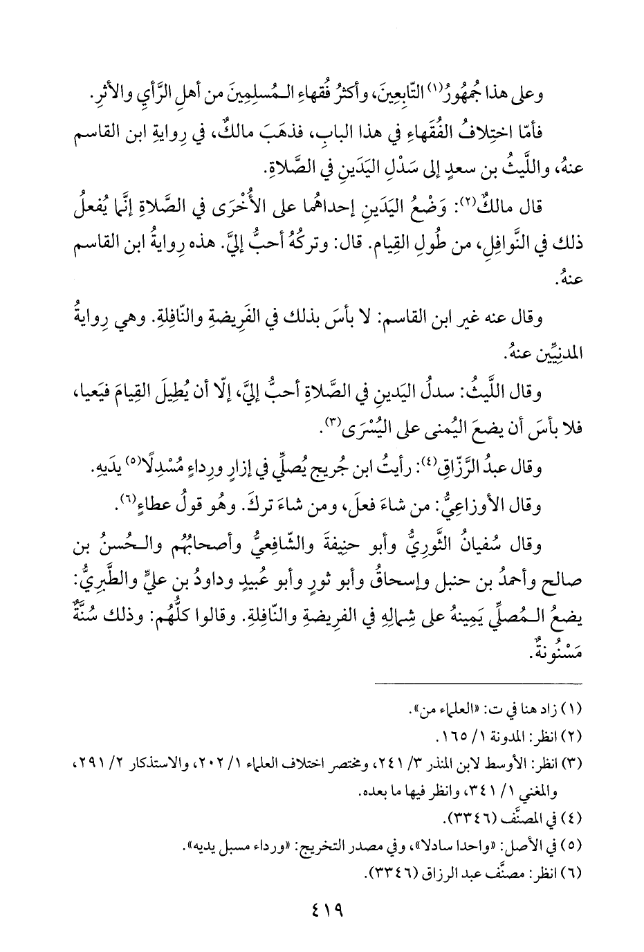 وقال سُفيانُ الثَّورِيُّ وأبو حنِيفةَ والشّافِعيُّ وأصحابُهُم والحُسنُ بن صالح وأحمدُ بن حنبل وإسحاقُ وأبو ثورٍ وأبو عُبيدٍ وداودُ بن عليٍّ والطَّبرِيُّ: يضعُ المُصلِّي يَمِينهُ على شِمالِهِ في الفرِيضةِ والنّافِلةِ. وقالوا كلُّهُم: وذلك سُنَّةٌ مَسْنُونةٌ.