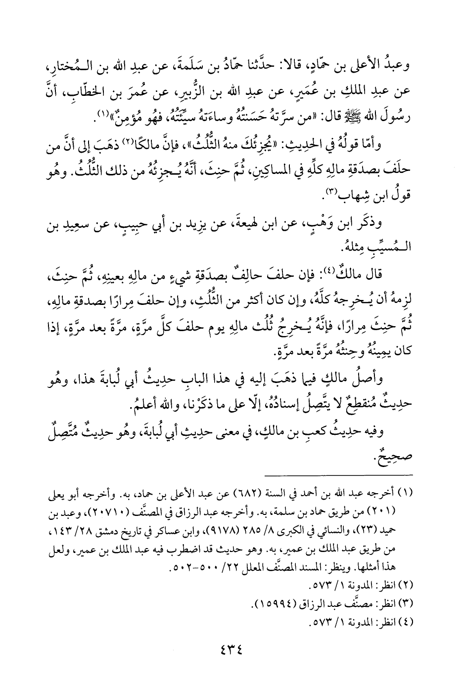 وفيه حدِيثُ كعبِ بن مالكٍ، في معنى حدِيثِ أبي لُبابةَ، وهُو حدِيثٌ مُتَّصِلٌ صحِيحٌ.