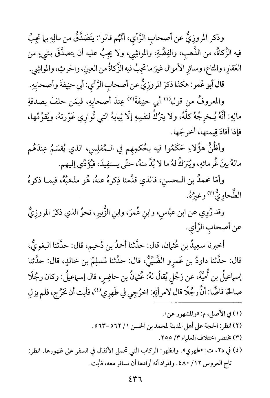 قال أبو عُمر: هكذا ذكرَ المروزِيُّ عن أصحابِ الرَّأيِ: أبي حنِيفةَ وأصحابِهِ.