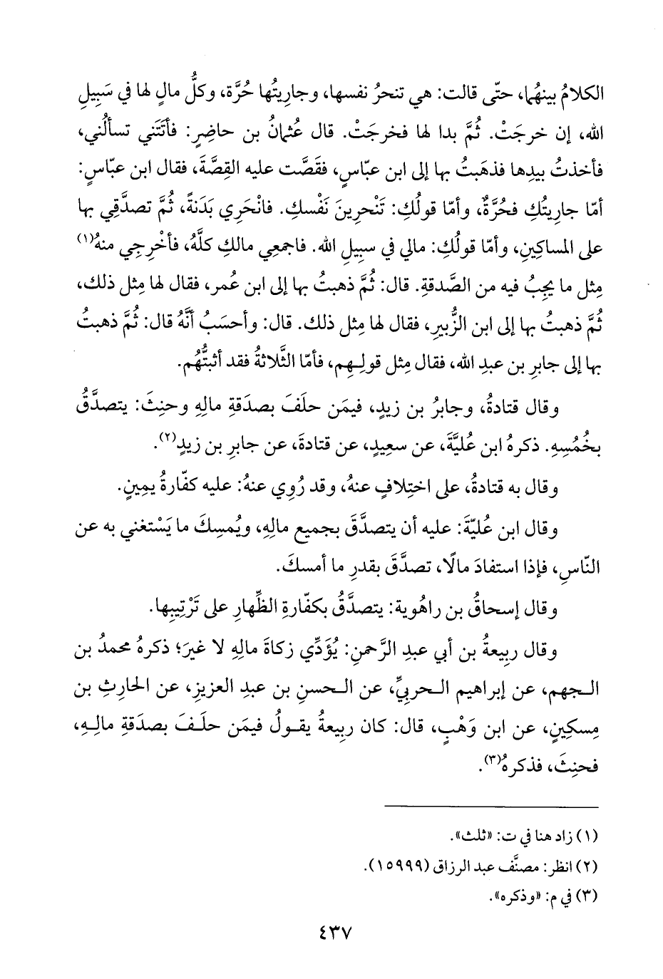 الكلامُ بينهُما، حتّى قالت: هي تنحرُ نفسها، وجارِيتُها حُرَّة، وكلُّ مالٍ لها في سَبِيلِ اللَّه، إن خرجَتْ. ثُمَّ بدا لها فخرجَتْ. قال عُثمانُ بن حاضِرٍ: فأتَتَني تسألُني، فأخذتُ بيدِها فذهَبتُ بها إلى ابن عبّاسٍ، فقَصَّت عليه القِصَّةَ، فقال ابن عبّاسٍ: أمّا جارِيتُكِ فحُرَّةٌ، وأمّا قولُكِ: تَنْحرِينَ نَفْسكِ. فانْحَرِي بَدَنةً، ثُمَّ تصدَّقِي بها على المساكِينِ، وأمّا قولُكِ: مالي في سبِيلِ اللَّه. فاجمعِي مالكِ كلَّهُ، فأخْرِجِي منهُ (¬١) مِثل ما يجِبُ فيه من الصَّدقةِ. قال: ثُمَّ ذهبتُ بها إلى ابن عُمر، فقال لها مِثل ذلك، ثُمَّ ذهبتُ بها إلى ابن الزُّبيرِ، فقال لها مِثل ذلك. قال: وأحسَبُ أَنَّهُ قال: ثُمَّ ذهبتُ بها إلى جابرِ بن عبدِ اللَّه، فقال مِثل قولِهِم، فأمّا الثَّلاثةُ فقد أثبتُّهُم.