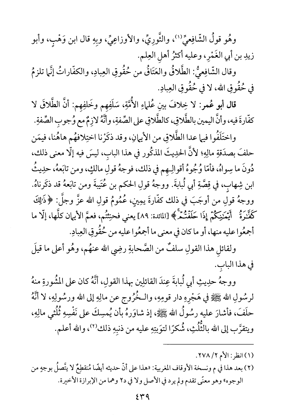 واختَلَفُوا فيما عدا الطَّلاقِ من الأيمانِ، وقد ذكَرْنا اختِلافهُم هاهُنا، فيمَن حلفَ بصدَقةِ مالِهِ؛ لأنَّ الحدِيثَ المذكُور في هذا البابِ، ليسَ فيه إلّا معنى ذلك، دُونَ ما سِواهُ، فأمّا وُجُوهُ أقوالِهِم في ذلك، فوجهُ قولِ مالكٍ، ومن تابَعهُ، حدِيثُ ابن شِهابٍ، في قِصَّةِ أبي لُبابةَ. ووجهُ قولِ الحكم بن عُتَيبةَ ومن تابَعهُ قد ذكَرناهُ. ووجهُ قولِ من أوجَبَ في ذلك كفّارةَ يمِينٍ، عُمُومُ قولِ اللَّه عزَّ وجلَّ: {ذَلِكَ كَفَّارَةُ أَيْمَانِكُمْ إِذَا حَلَفْتُمْ} [المائدة: ٨٩] يعني فحنِثتُم، فعمَّ الأيمان كلَّها، إلّا ما أجمعُوا عليه منها، أو ما كان في معنى ما أجمعُوا عليه من حُقُوقِ العِبادِ.