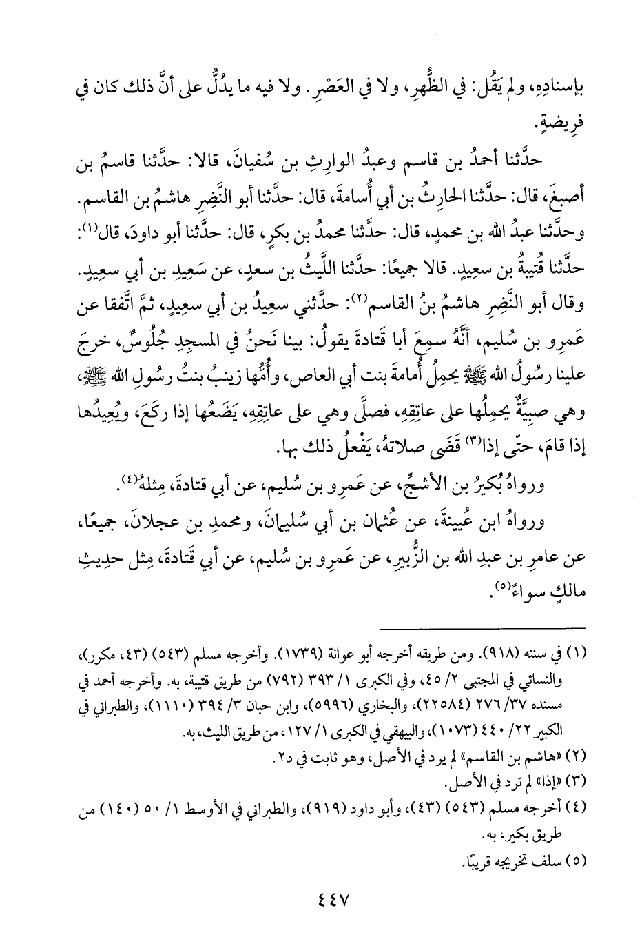 حدَّثنا أحمدُ بن قاسم وعبدُ الوارِثِ بن سُفيانَ، قالا: حدَّثنا قاسمُ بن أصبغَ، قال: حدَّثنا الحارِثُ بن أبي أُسامةَ، قال: حدَّثنا أبو النَّضِرِ هاشمُ بن القاسم. وحدَّثنا عبدُ اللَّه بن محمدٍ، قال: حدَّثنا محمدُ بن بكرٍ، قال: حدَّثنا أبو داودَ، قال (¬١): حدَّثنا قُتيبةُ بن سعِيدٍ. قالا جميعًا: حدَّثنا اللَّيثُ بن سعدٍ، عن سَعِيدِ بن أبي سعِيدٍ. وقال أبو النَّضِرِ هاشمُ بنُ القاسم (¬٢): حدَّثني سعِيدُ بن أبي سعِيدٍ، ثمَّ اتَّفقا عن عَمرِو بن سُليم، أنَّهُ سمِعَ أبا قَتادةَ يقولُ: بينا نَحنُ في المسجِدِ جُلُوسٌ، خرجَ علينا رسولُ اللَّه -صلى اللَّه عليه وسلم- يحمِلُ أُمامةَ بنت أبي العاص، وأُمُّها زينبُ بنتُ رسُولِ اللَّه -صلى اللَّه عليه وسلم-، وهي صبِيَّةٌ يحمِلُها على عاتِقِهِ، فصلَّى وهي على عاتِقِهِ، يَضَعُها إذا ركَعَ، ويُعِيدُها إذا قامَ، حتّى إذا (¬٣) قَضَى صلاتهُ، يَفْعلُ ذلك بها.