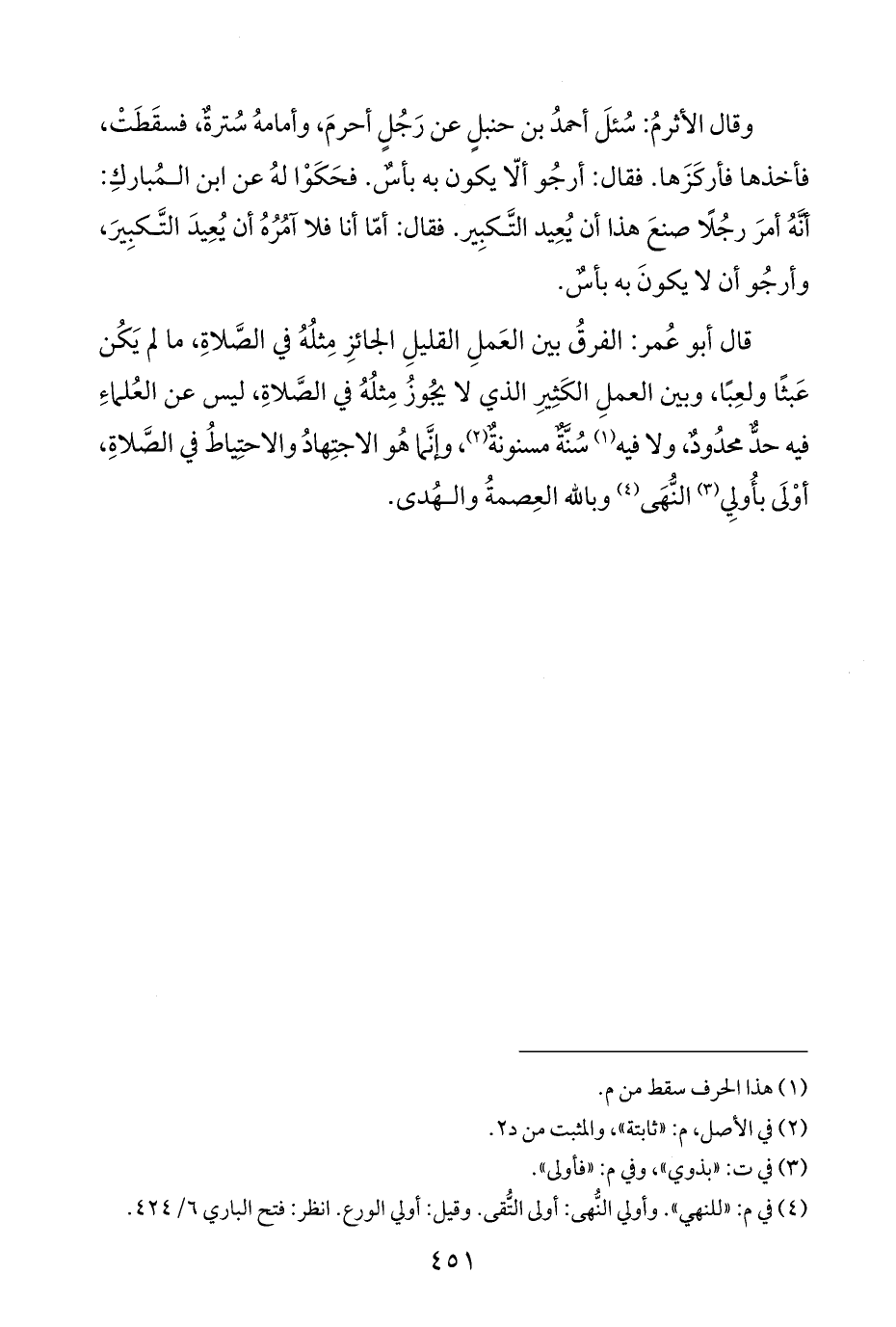 قال أبو عُمر: الفرقُ بين العَملِ القليلِ الجائزِ مِثلُهُ في الصَّلاةِ، ما لم يَكُن عَبثًا ولعِبًا، وبين العملِ الكَثِيرِ الذي لا يجُوزُ مِثلُهُ في الصَّلاةِ، ليس عن العُلماءِ فيه حدٌّ محدُودٌ، ولا فيه (¬١) سُنَّةٌ مسنونةٌ (¬٢)، وإنَّما هُو الاجتِهادُ والاحتِياطُ في الصَّلاةِ، أوْلَى بأُولِي (¬٣) النُّهَى (¬٤) وباللَّه العِصمةُ والهُدى.