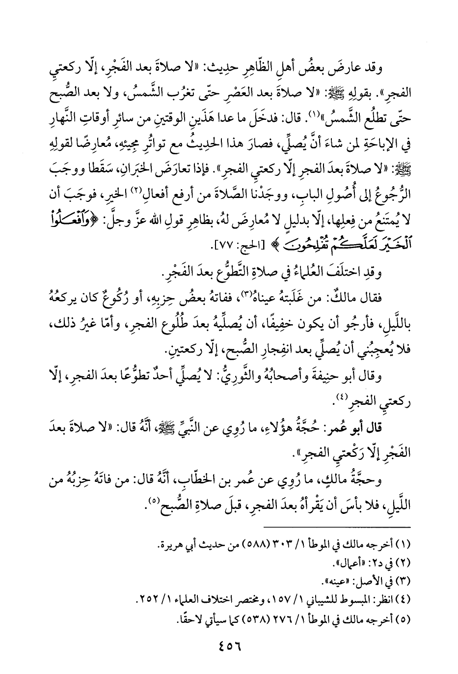قال أبو عُمر: حُجَّةُ هؤُلاءِ، ما رُوِي عن النَّبيِّ -صلى اللَّه عليه وسلم-، أنَّهُ قال: "لا صلاةَ بعدَ الفَجْرِ إلّا رَكْعتيِ الفجرِ".