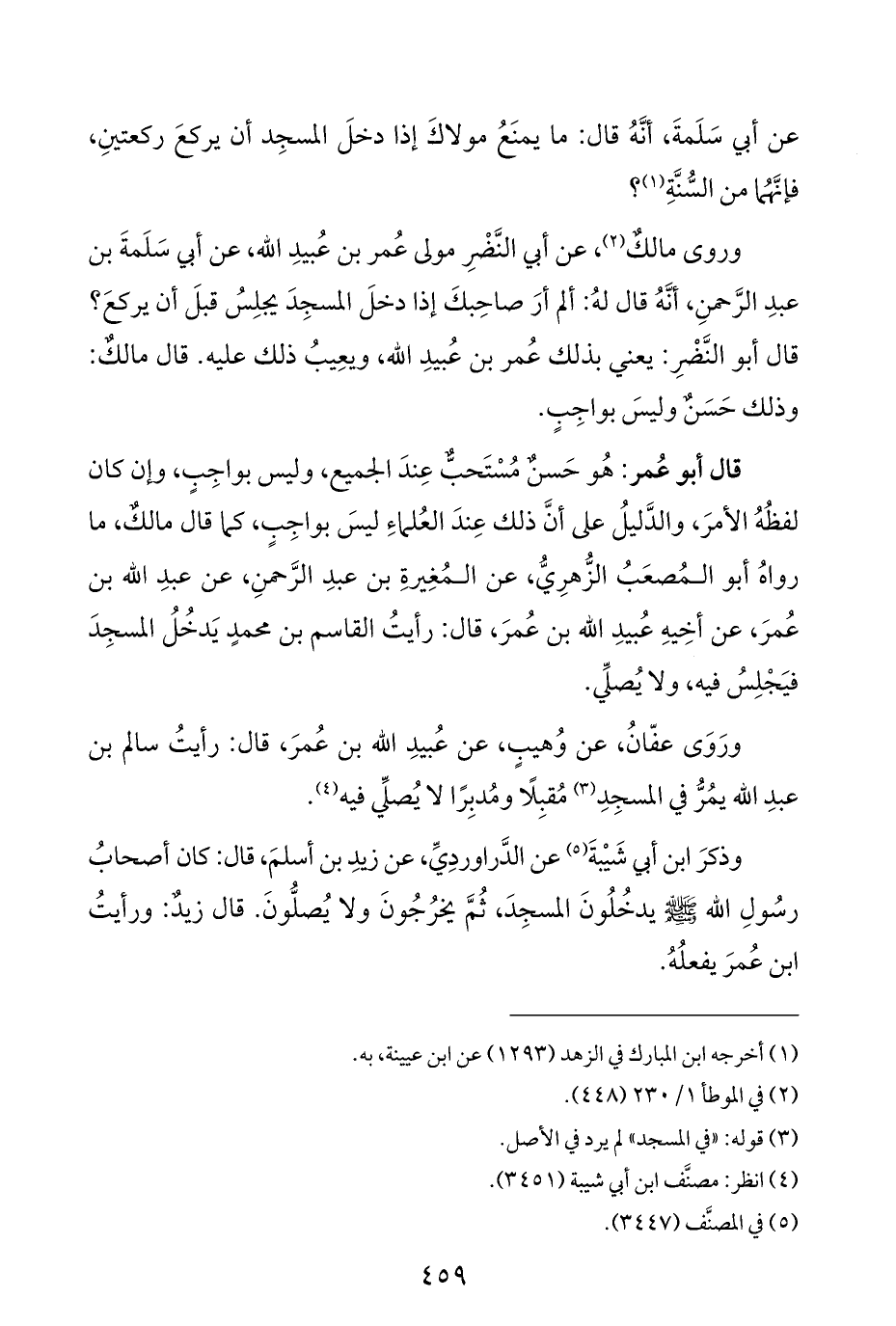 قال أبو عُمر: هُو حَسنٌ مُسْتَحبٌّ عِندَ الجميع، وليس بواجِبٍ، وإن كان لفظُهُ الأمرَ، والدَّليلُ على أنَّ ذلك عِندَ العُلماءِ ليسَ بواجِبٍ، كما قال مالكٌ، ما رواهُ أبو المُصعَبُ الزُّهرِيُّ، عن المُغِيرةِ بن عبدِ الرَّحمنِ، عن عبدِ اللَّه بن عُمرَ، عن أخِيهِ عُبيدِ اللَّه بن عُمرَ، قال: رأيتُ القاسم بن محمدٍ يَدخُلُ المسجِدَ فيَجْلِسُ فيه، ولا يُصلِّي.
