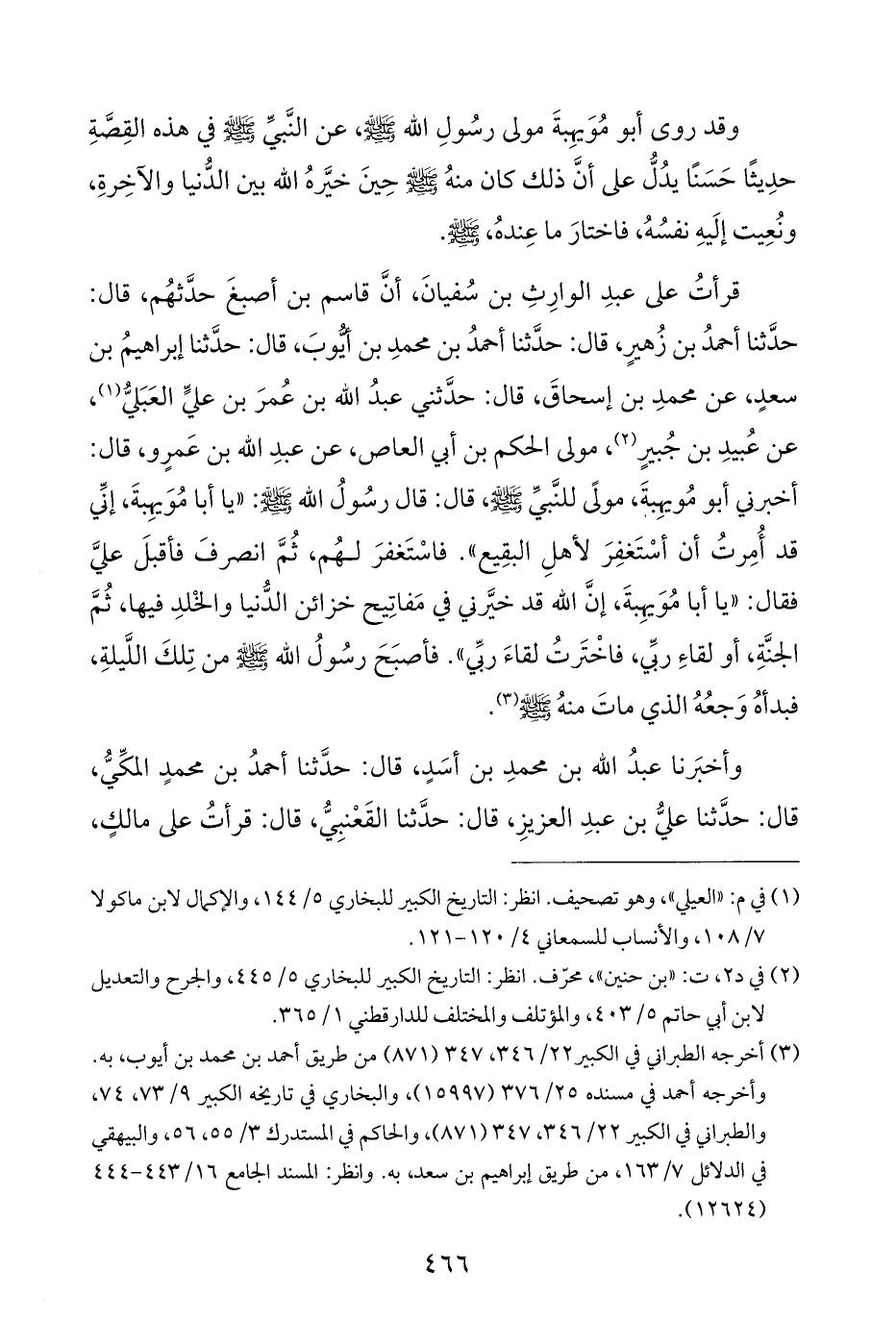 قرأتُ على عبدِ الوارِثِ بن سُفيانَ، أنَّ قاسم بن أصبغَ حدَّثهُم، قال: حدَّثنا أحمدُ بن زُهيرٍ، قال: حدَّثنا أحمدُ بن محمدِ بن أيُّوبَ، قال: حدَّثنا إبراهيمُ بن سعدٍ، عن محمدِ بن إسحاقَ، قال: حدَّثني عبدُ اللَّه بن عُمرَ بن عليٍّ العَبَليُّ (¬١)، عن عُبيدِ بن جُبيرٍ (¬٢)، مولى الحكم بن أبي العاص، عن عبدِ اللَّه بن عَمرٍو، قال: أخبرني أبو مُويهِبةَ، مولًى للنَّبيِّ -صلى اللَّه عليه وسلم-، قال: قال رسُولُ اللَّه -صلى اللَّه عليه وسلم-: "يا أبا مُوَيهِبةَ، إنِّي قد أُمِرتُ أن أسْتَغفِرَ لأهلِ البقِيع". فاسْتَغفرَ لهُم، ثُمَّ انصرفَ فأقبلَ عليَّ فقال: "يا أبا مُوَيهِبةَ، إنَّ اللَّه قد خيَّرني في مَفاتِيح خزائن الدُّنيا والخْلدِ فيها، ثُمَّ الجنَّةِ، أو لقاءِ ربِّي، فاخْتَرتُ لقاءَ ربِّي". فأصبَحَ رسُولُ اللَّه -صلى اللَّه عليه وسلم- من تِلكَ اللَّيلةِ، فبدأهُ وَجعُهُ الذي ماتَ منهُ -صلى اللَّه عليه وسلم- (¬٣).